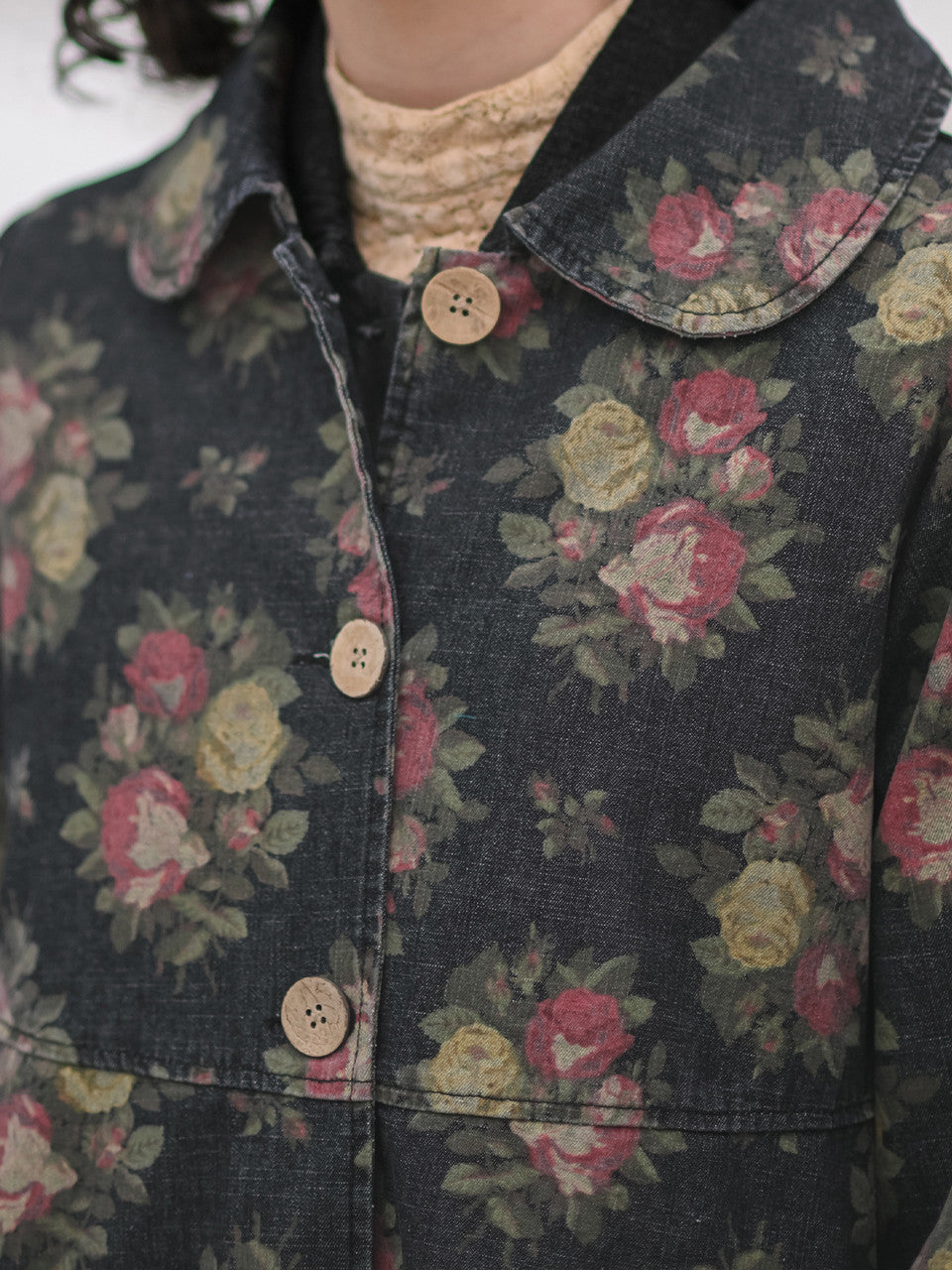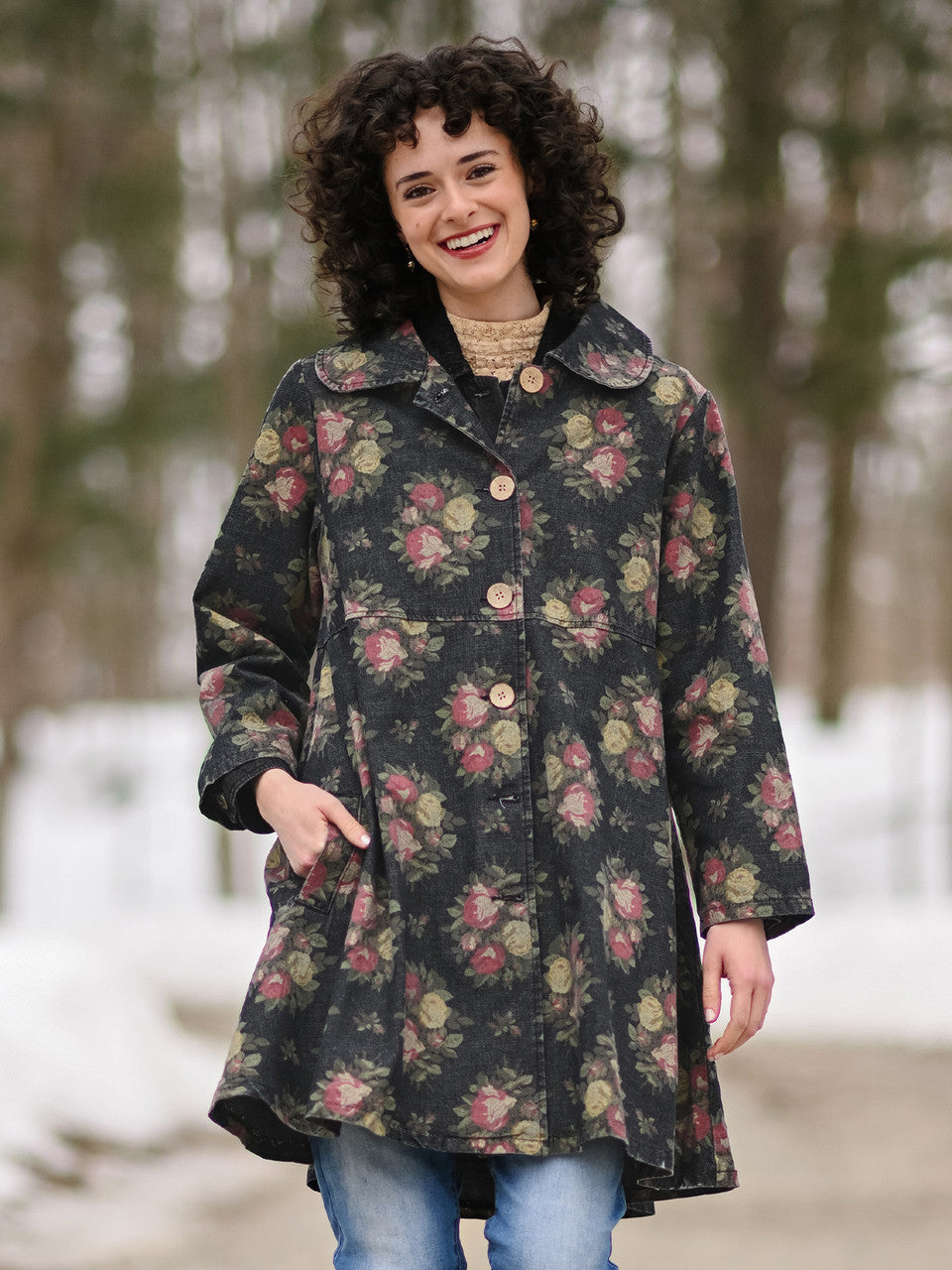 Fetch your market basket and frolic off to your favorite fall festivities. In wonderful cotton denim with a moody charcoal print, this darling jacket features a classic rounded collar, large wood buttons, a flattering seam at the waist and front inset pockets. Truly an investment piece to be loved for years to come. Limited availability. Free shipping and complimentary floral tote with your purchase
