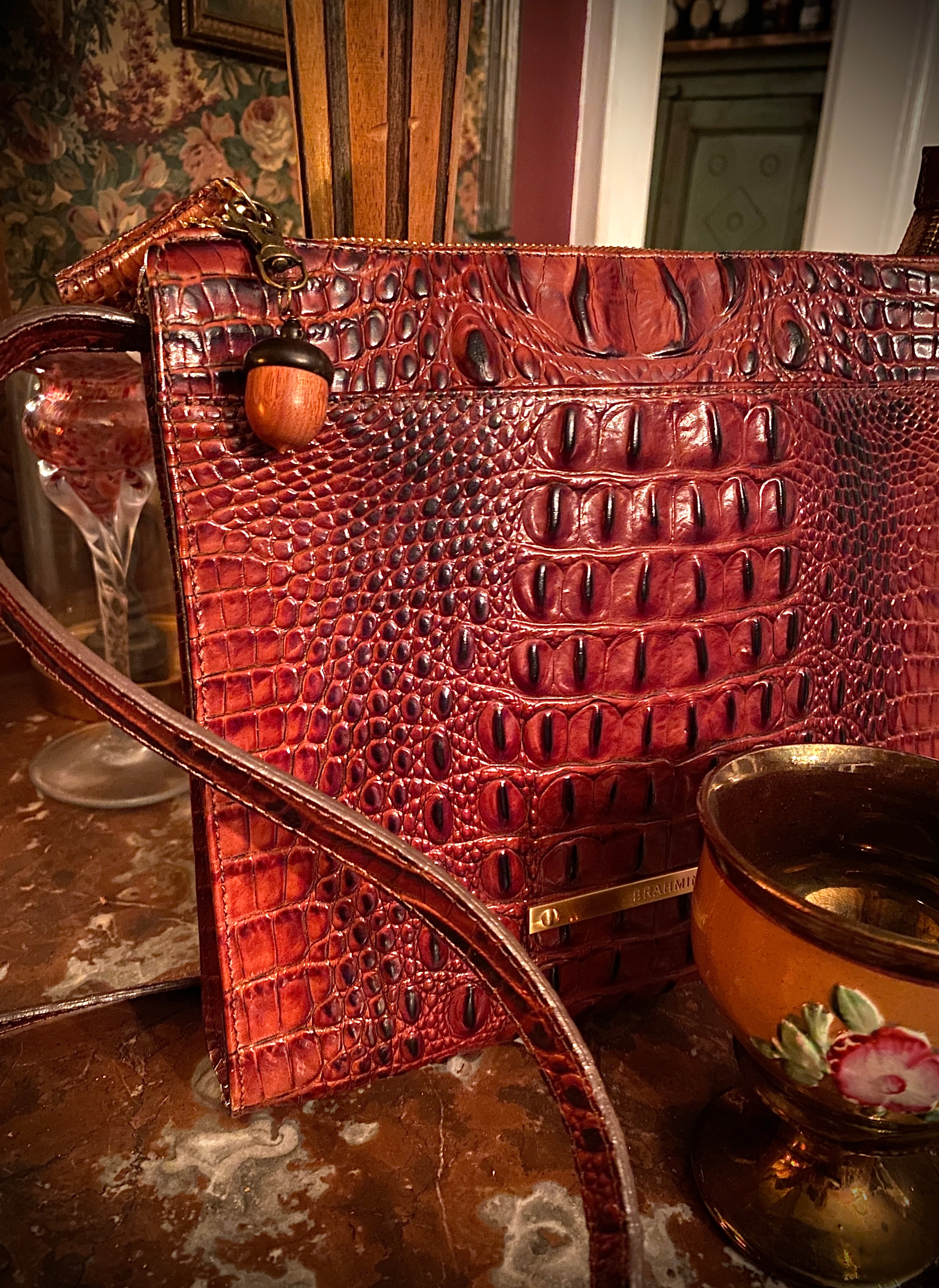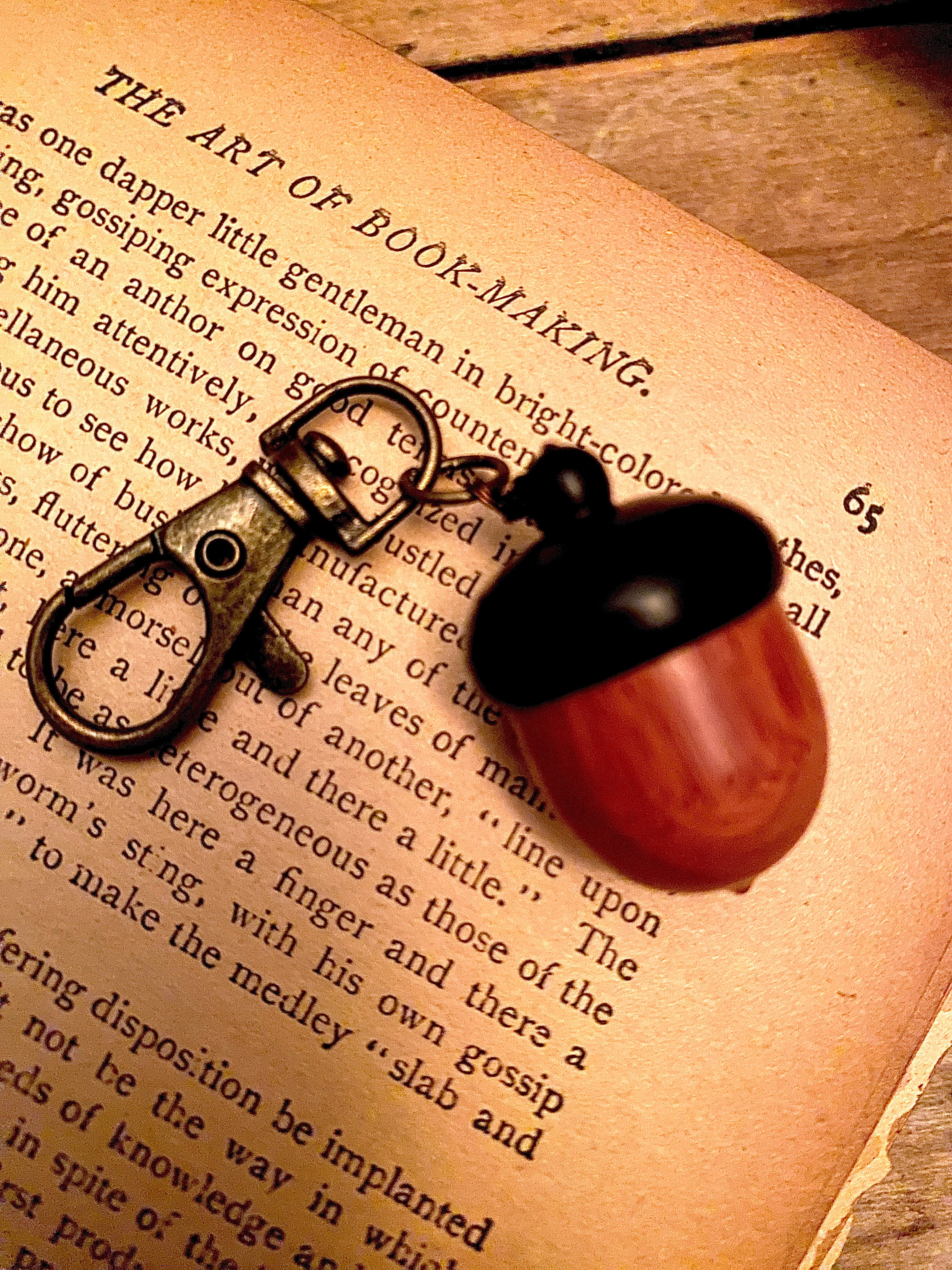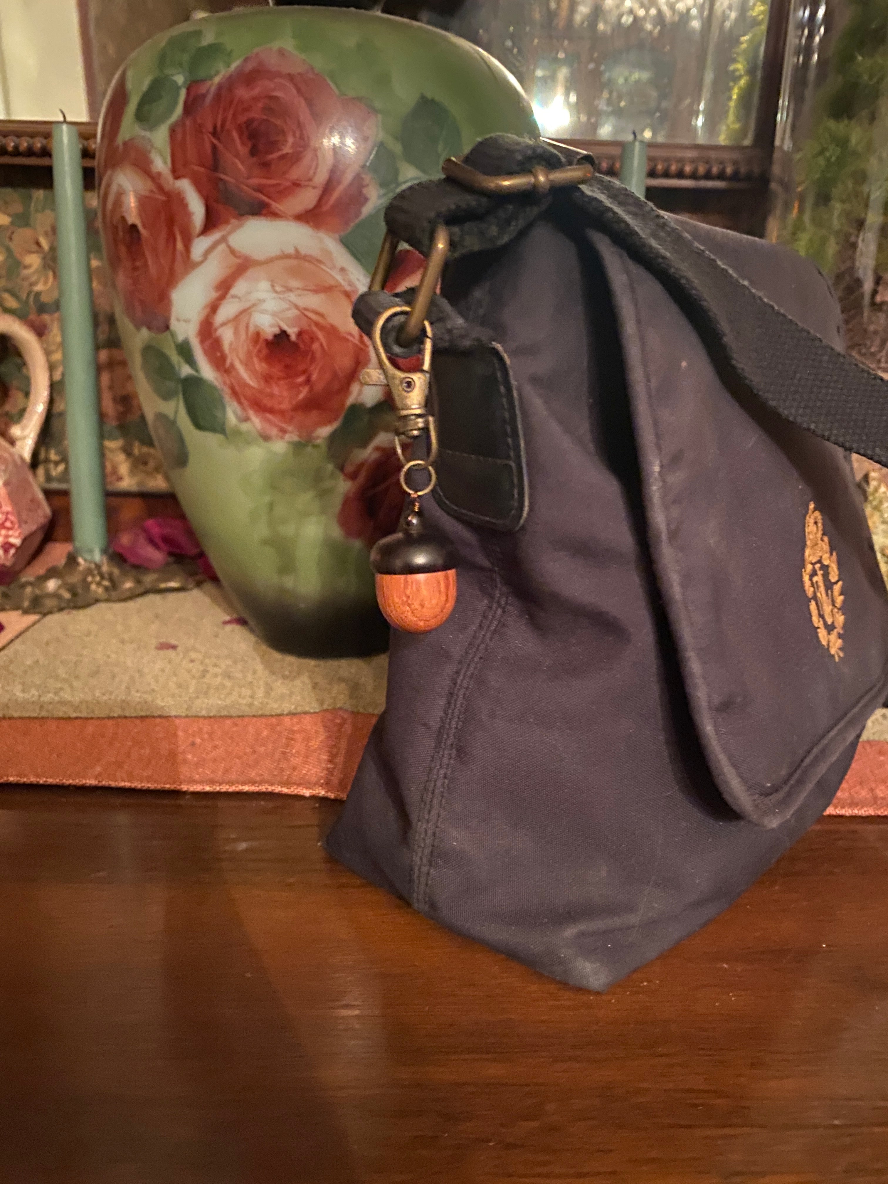 Wooden acorns offer a hiding place for tiny items…baby aspirin, a perfume-soaked scrap, stud earrings, a meaningful artifact, or maybe a folded twenty dollar bill. For centuries the acorn has held spiritual lore as a talisman of protection. Lobster clasp easily attached to a brass purse ring or zipper tag. 1” nut.