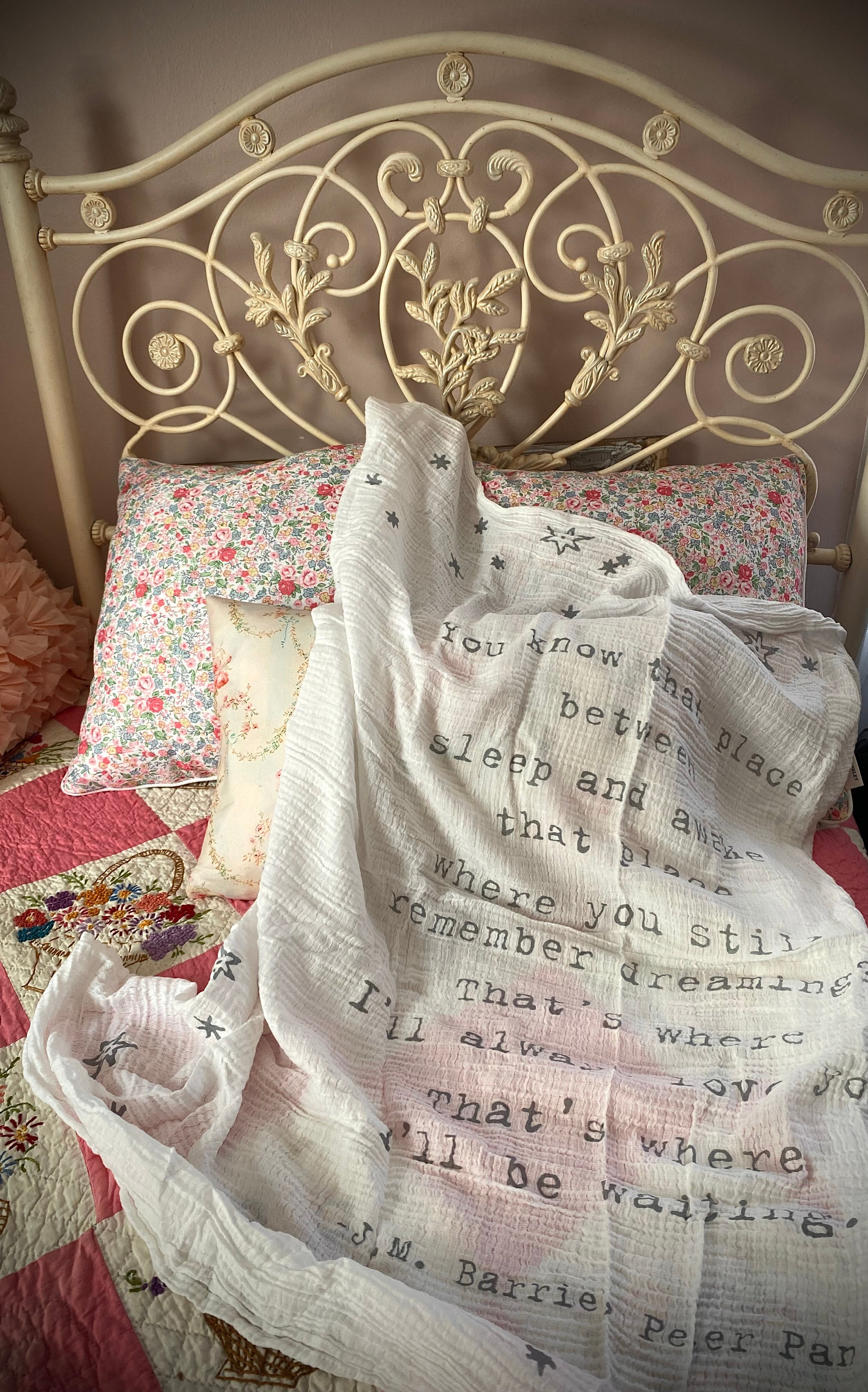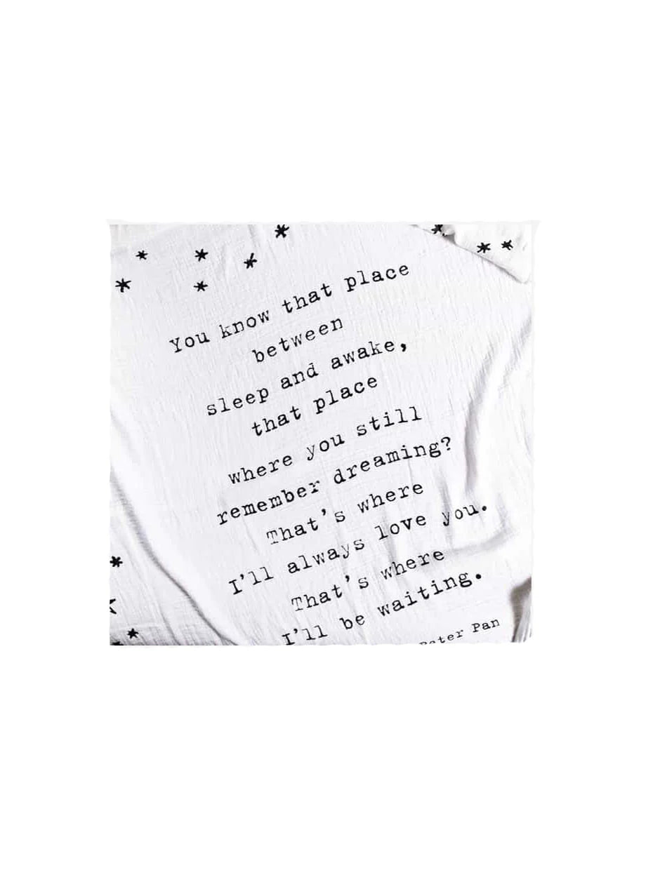A beloved except from Peter Pan is forever rendered upon dreamy organic muslin gauze making it a perfect gift for the stork’s latest delivery. 100% guaranteed to promote sweet slumber, organic muslin gauze swaddle printed with eco-friendly, safe ink to wrap a newborn baby snug as a bug. 47 x 47 inches