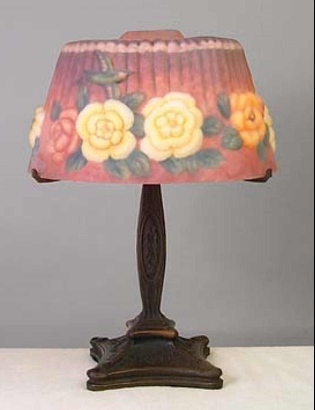 Created in the tradition of a coveted heirloom, this exquisite replica of a Victorian Pairpoint Puffy lamp will cast a dreamy ambiance upon evenings spent in the comfort of your home. Glass Shade on Ornate Bronze base. 14 (w) x 14 (l) x 20 (h)