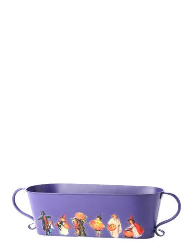 Winsome characters culled from Victorian greeting cards and ephemera parade across a charming receptacle for wrapped candies and your favorite spooky treats. Sturdy Metal Tub with handles. Limited 4 left.