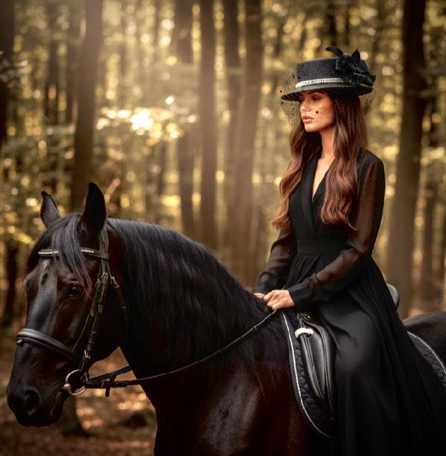 For those longing for a smoldering classic beauty, this hat is simply enchanting. A flattering vintage style top hat body is adorned with dramatic double strand band of pearls, ebony blooms and ribbons create a stunning walk-away feature while a sweeping veil allows the most coquettish of glances.
