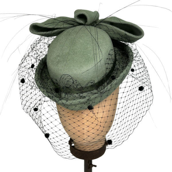 This timeless beauty in soft sage will elevate any ensemble. A coquettish veil softens your guise while sending waves of envy through a crowd. This magnificent millinery creation is traditionally handmade by a family company on the East Coast that hand shapes and appoints every detail.