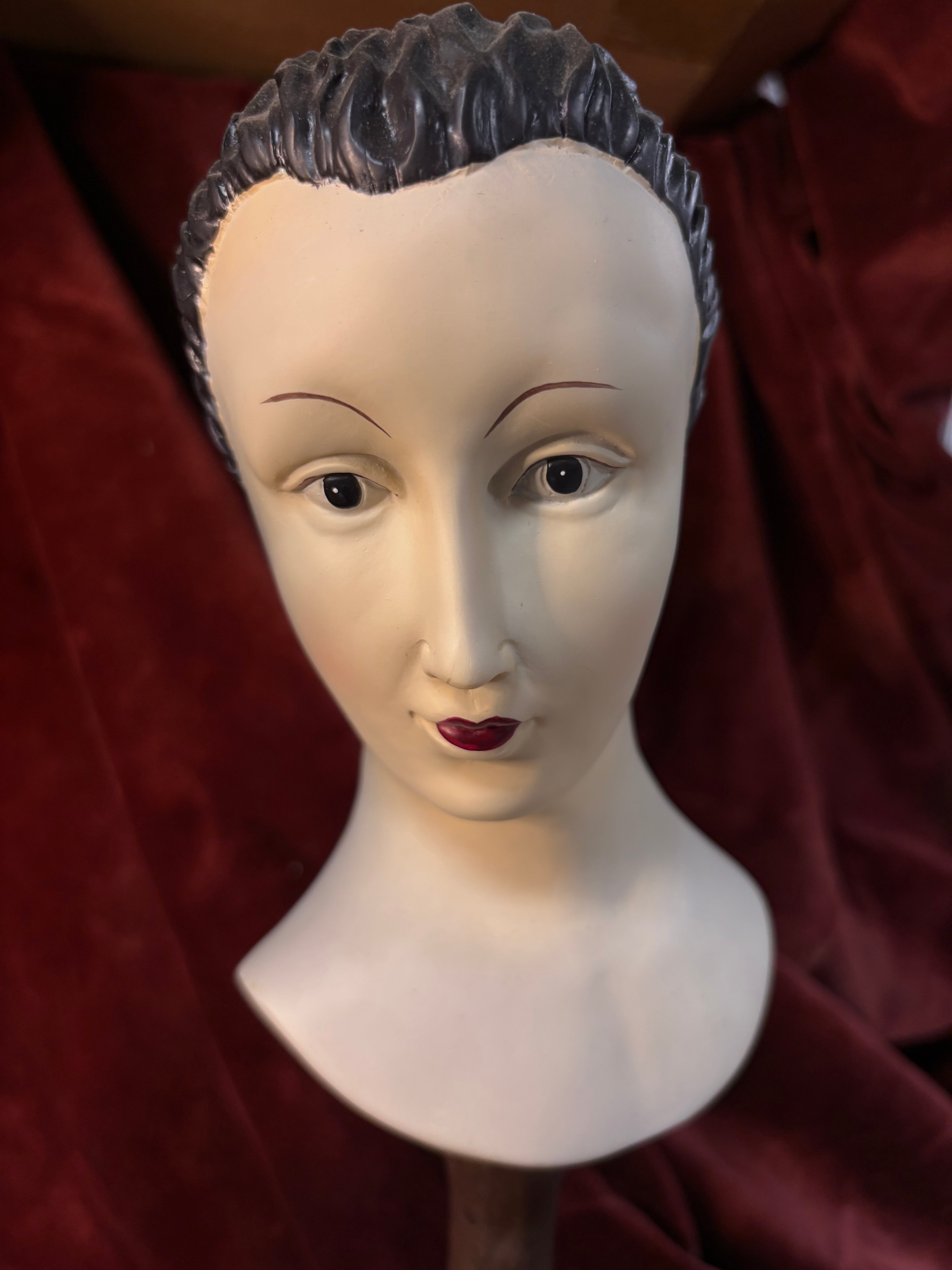 A pair of lovely lasses lay in waiting, ready to host your prettiest hat or hairpiece. Once a stable in every boudoir, these cast forms are carefully crafted from antiques and add whimsy and charm to any room or display. Wooden base. Limited quantities available Maude 15x 5 inches. Mabel 17x5 inches.