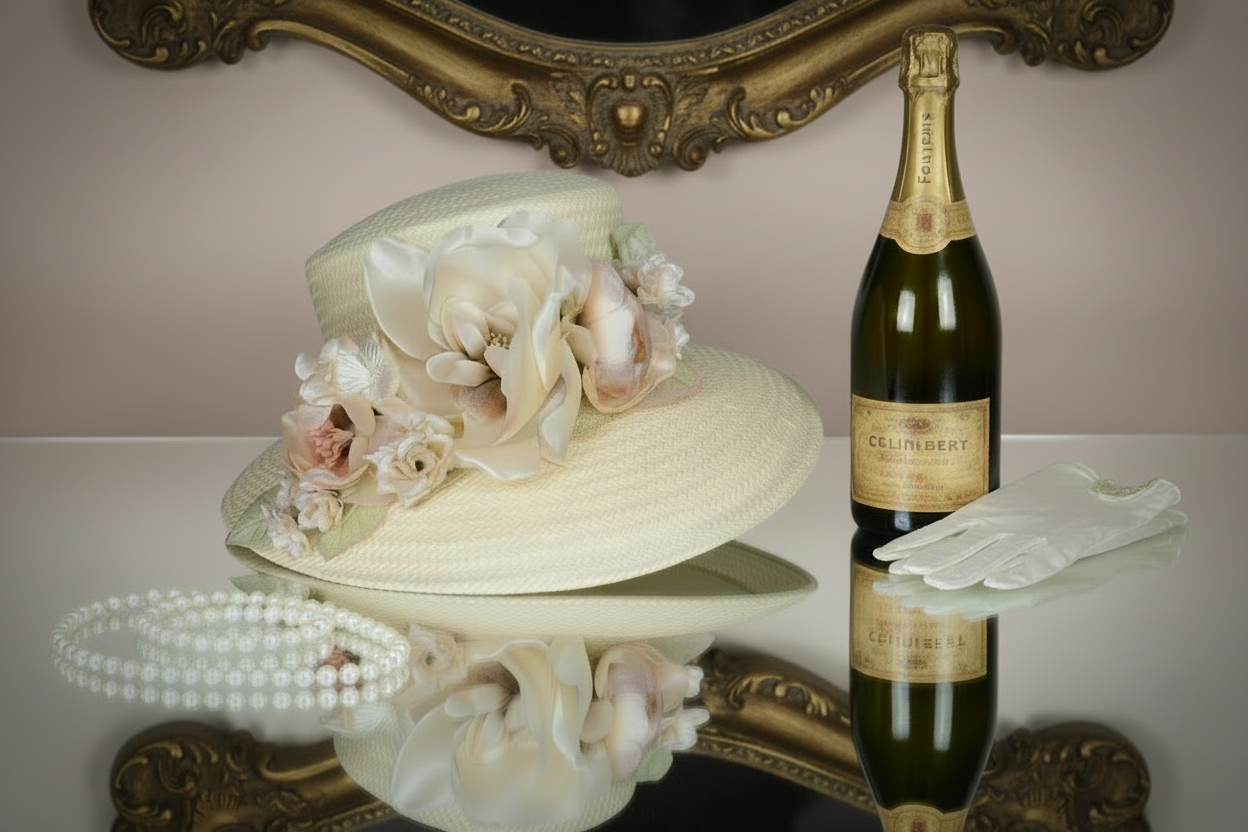 Cheers to this lampshade stunner, sure to keep the champagne showers away from the fairest of face. An array of cream and blush roses tumble about the crown of this feminine beauty made of the finest millinery straw and vintage style blooms.