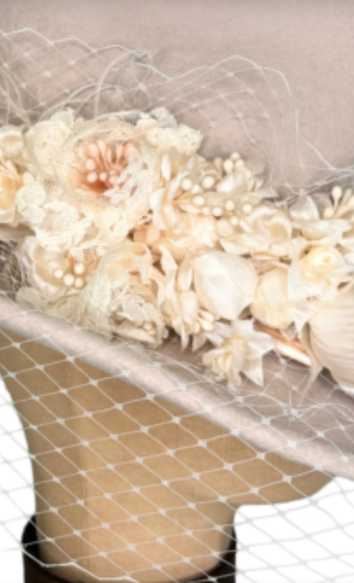 Adorned with clusters of lush cream roses and a coquettish veil and finished with a dramatic curled ostrich feather, this wool hat will be the perfect statement piece. Flattering sweep of delicate veil can be worn low or high and each millinery treasure is hand-appointed and formed on vintage equipment by a family business in New Jersey. We will include a hat pin with your purchase. Free Shipping!