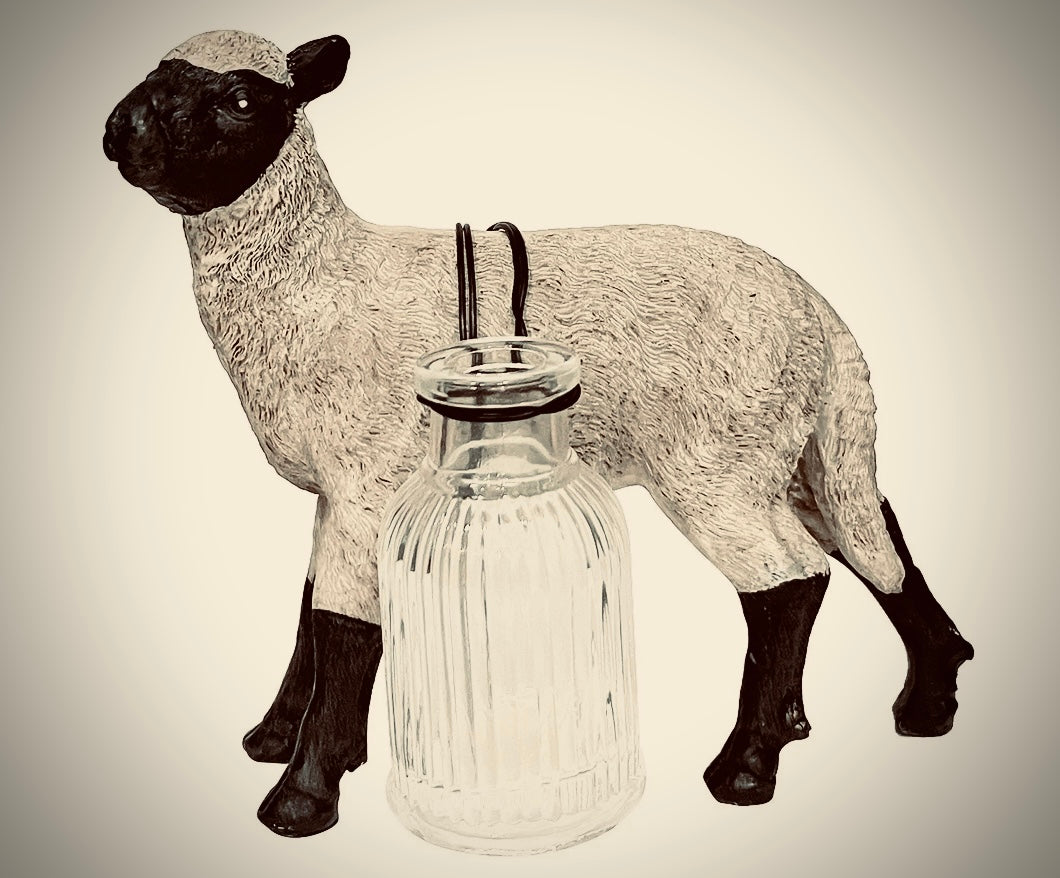 Cotswold charm abounds when this li’l lamb bears fresh cuttings of herbs or floral sprigs. Maybe poke candy sticks into the glass. Or maybe cotton swabs or wooden matches…the woolly fella will warm hearts. Two ribbed glass vases straddle hand-painted pine resin that appears to be chalkware. 6.3x5.4x5”.