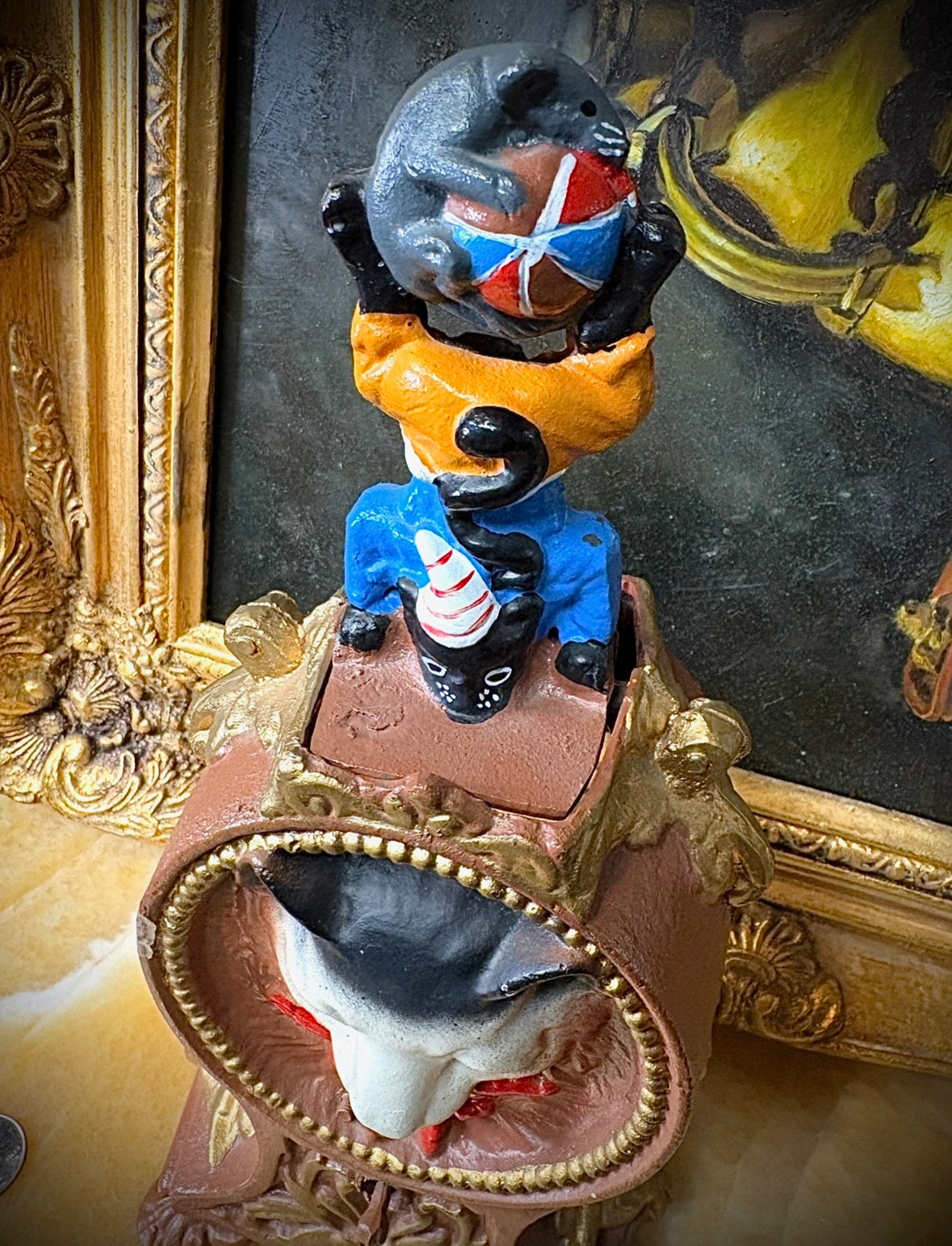 Circa 1880, this cast iron curiosity hails from its clever predecessor. Tuck a coin beneath mousekin’s  nose, touch the button and be delighted in wnat follows! Cast Iron