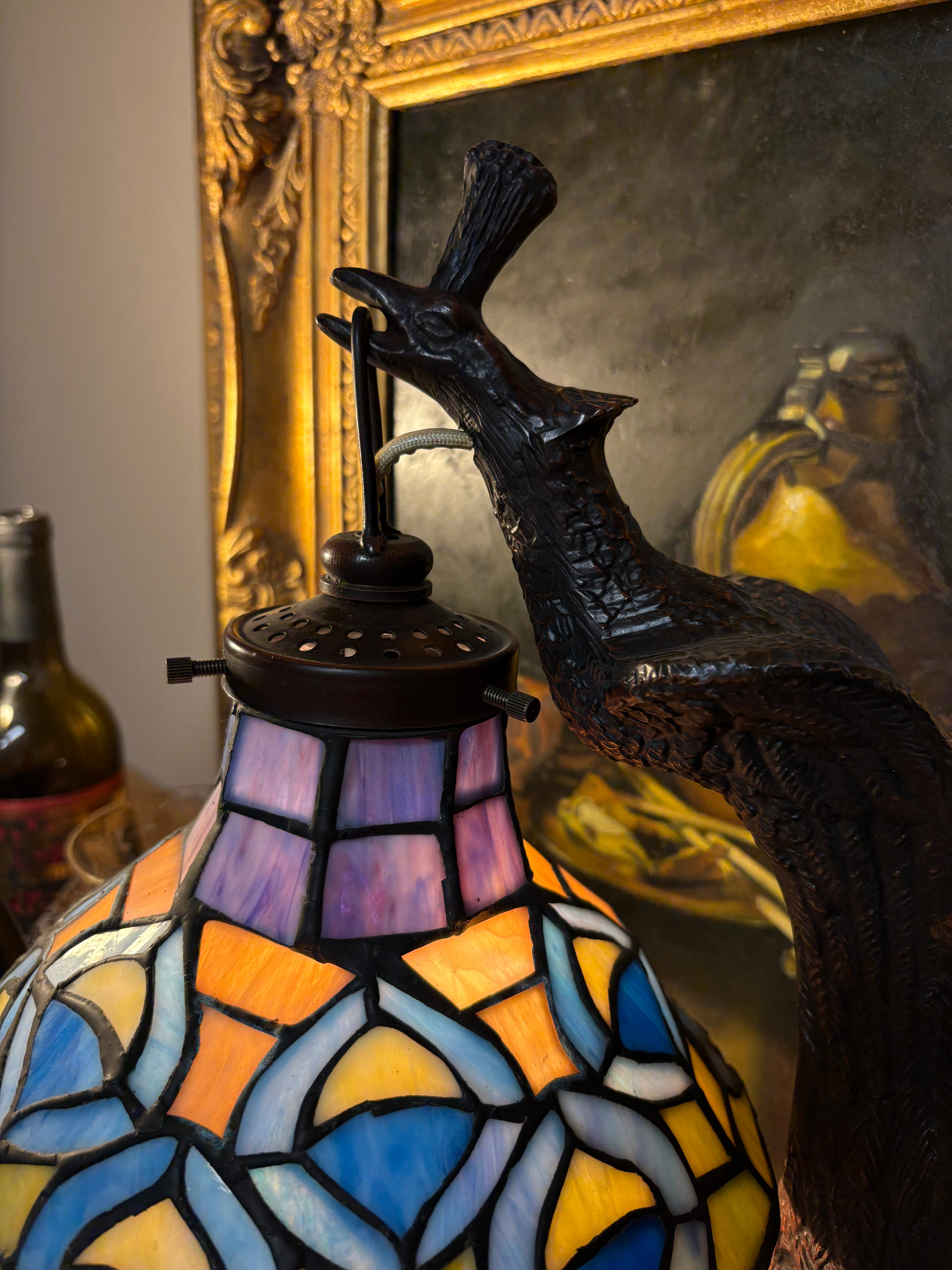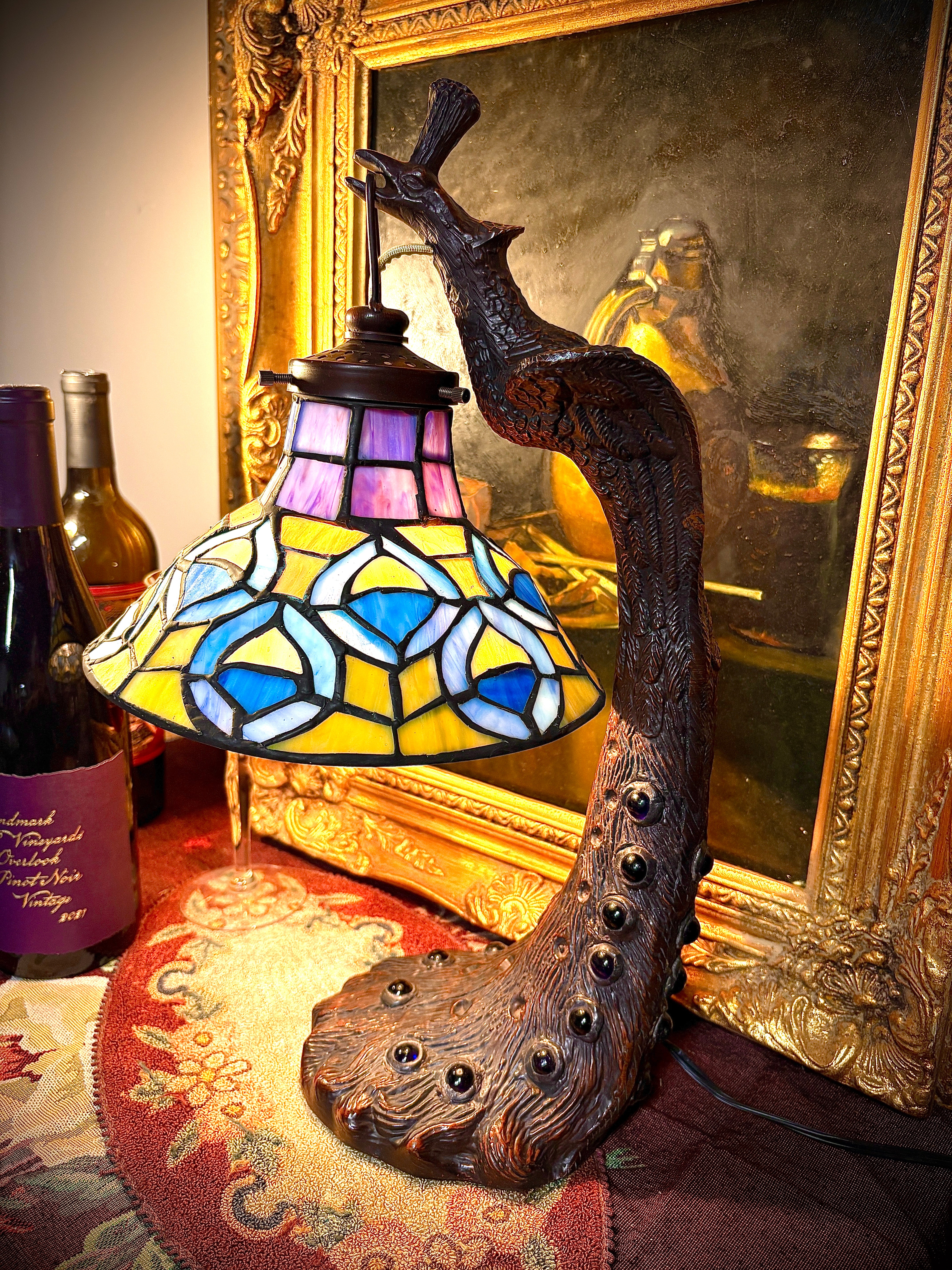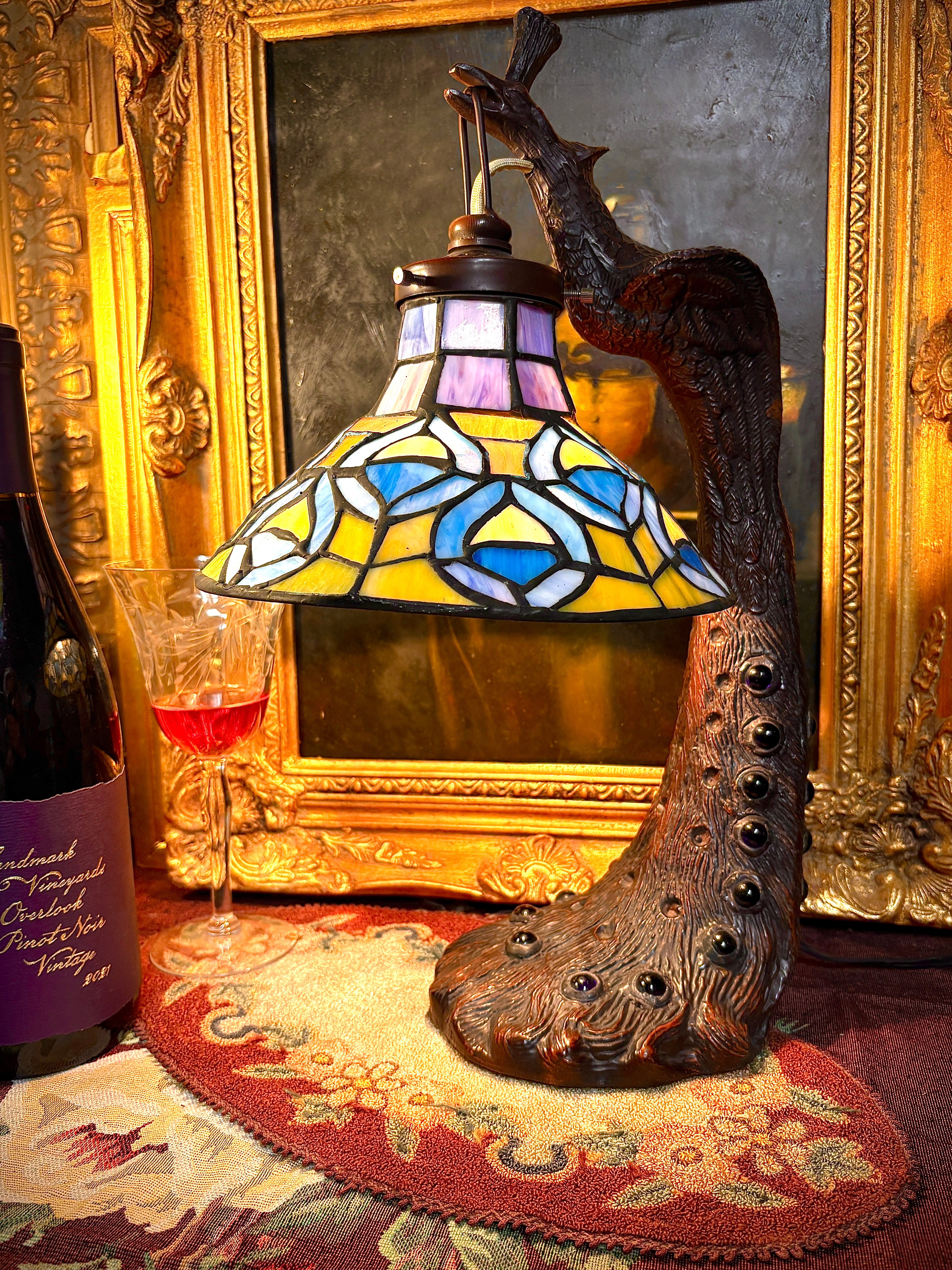 The jewel-plumed bird was a favorite motif during the art nouveau and art deco movements. This replica lamp is revisited with authenticity, and invites light to exude the vibrant hand-soldered art glass. Bronze. 19”. Candelabra-base bulb. Iron with bronze patina.