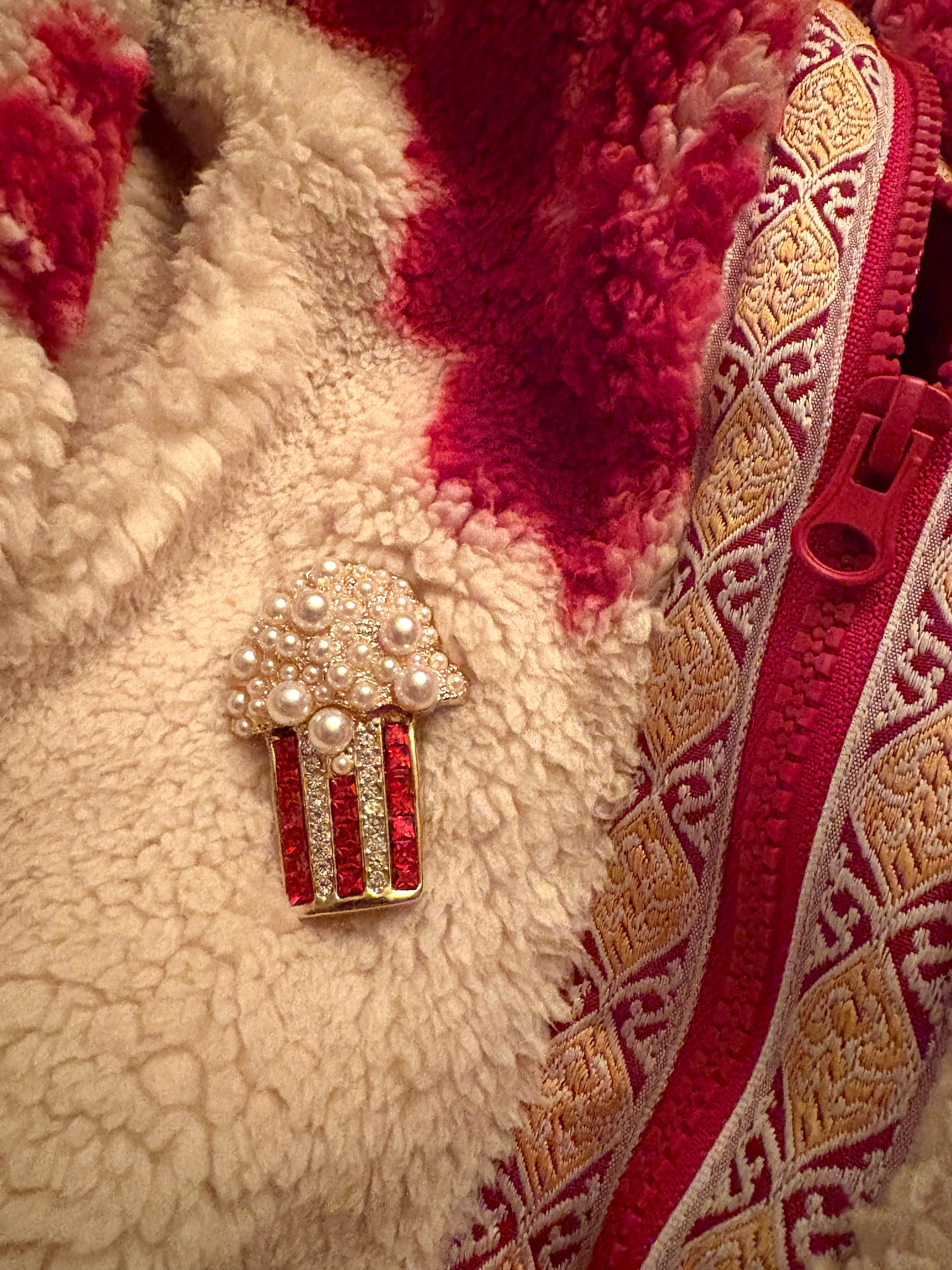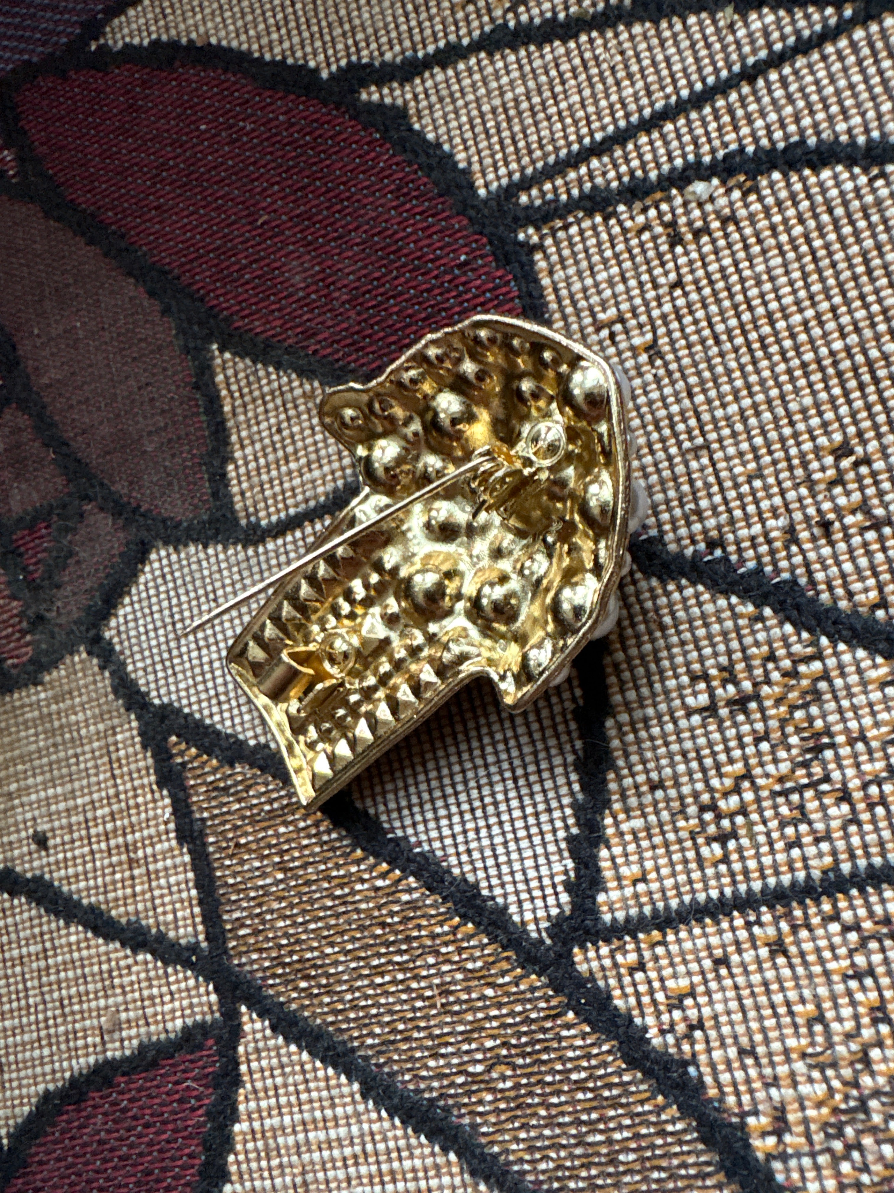 Ah, movie night! Whether pinned to your bathrobe while curled up on the couch with a loved one or worn to adorn a sweater to the local film house, this precious brooch is brings as much joy as butter on theater popcorn. A regular group of gals who meet up for Tuesdays matinees sport this with sisterly glee. I like to gift this for birthdays with cinema tickets for two. 2” Glass pearls, crystals on goldplated copper.