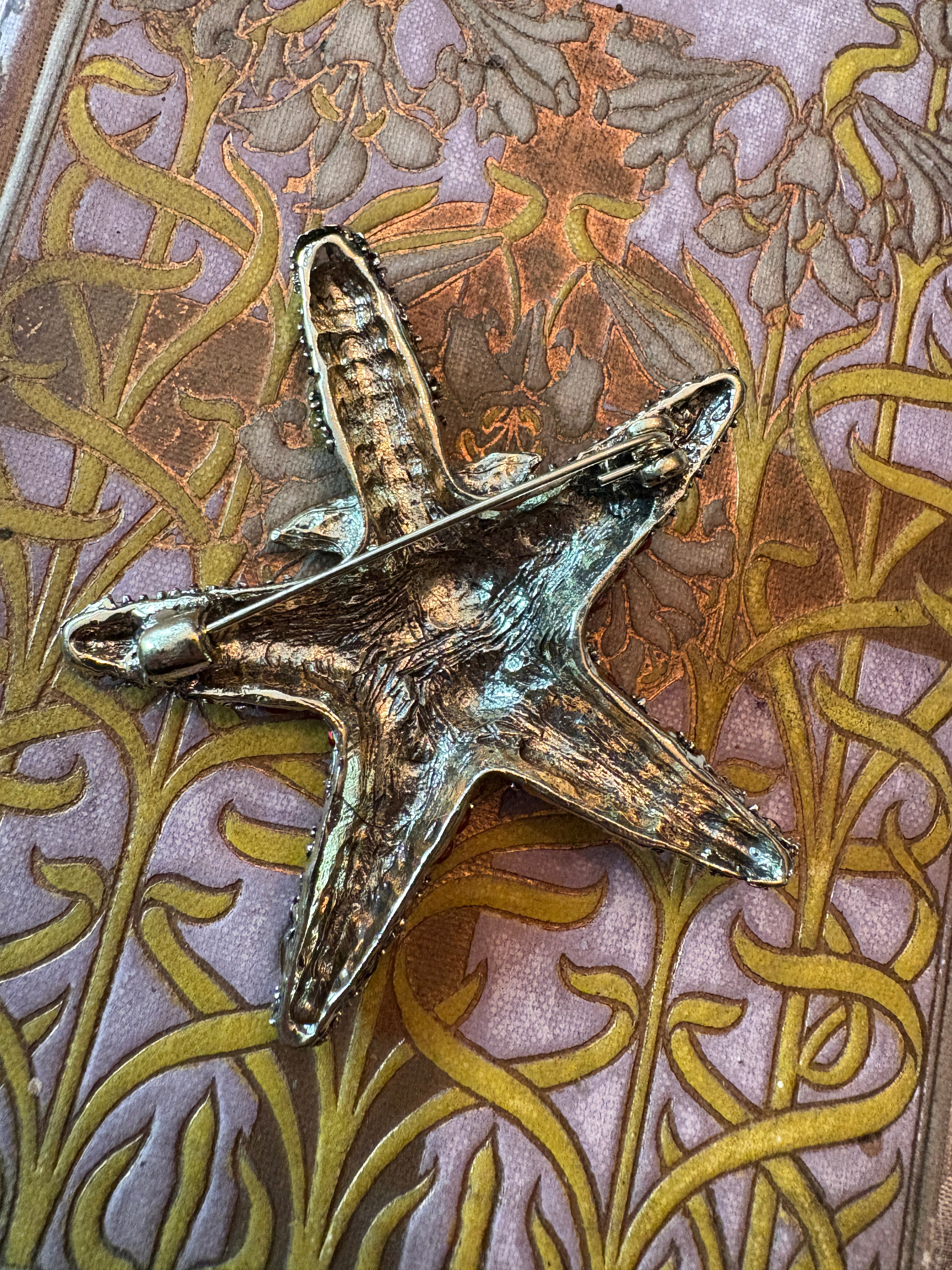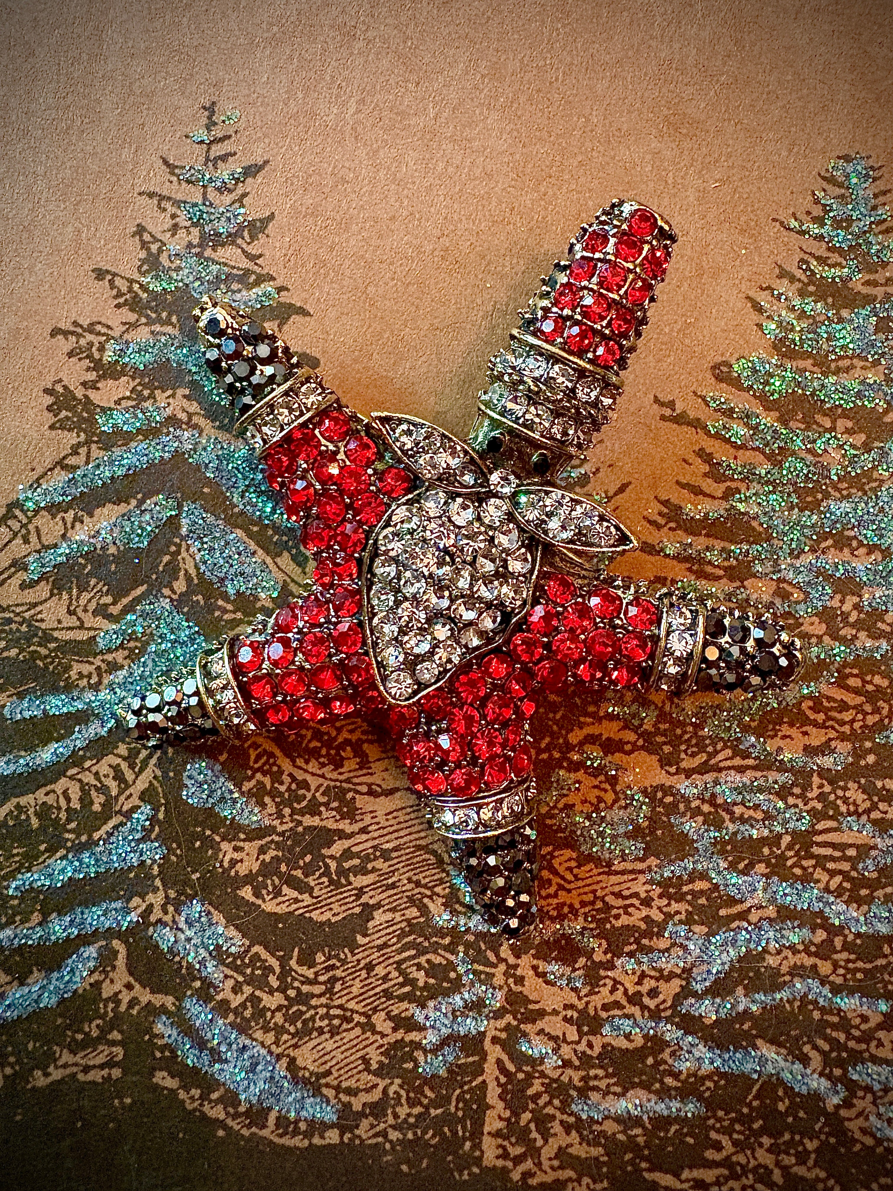 This lil guy is decked out in too many crystals to count…and they are oxidized to appear as though the stones witnessed holidays when Nat King Cole and Bing were crooning. We just adore him. Brass plated copper.