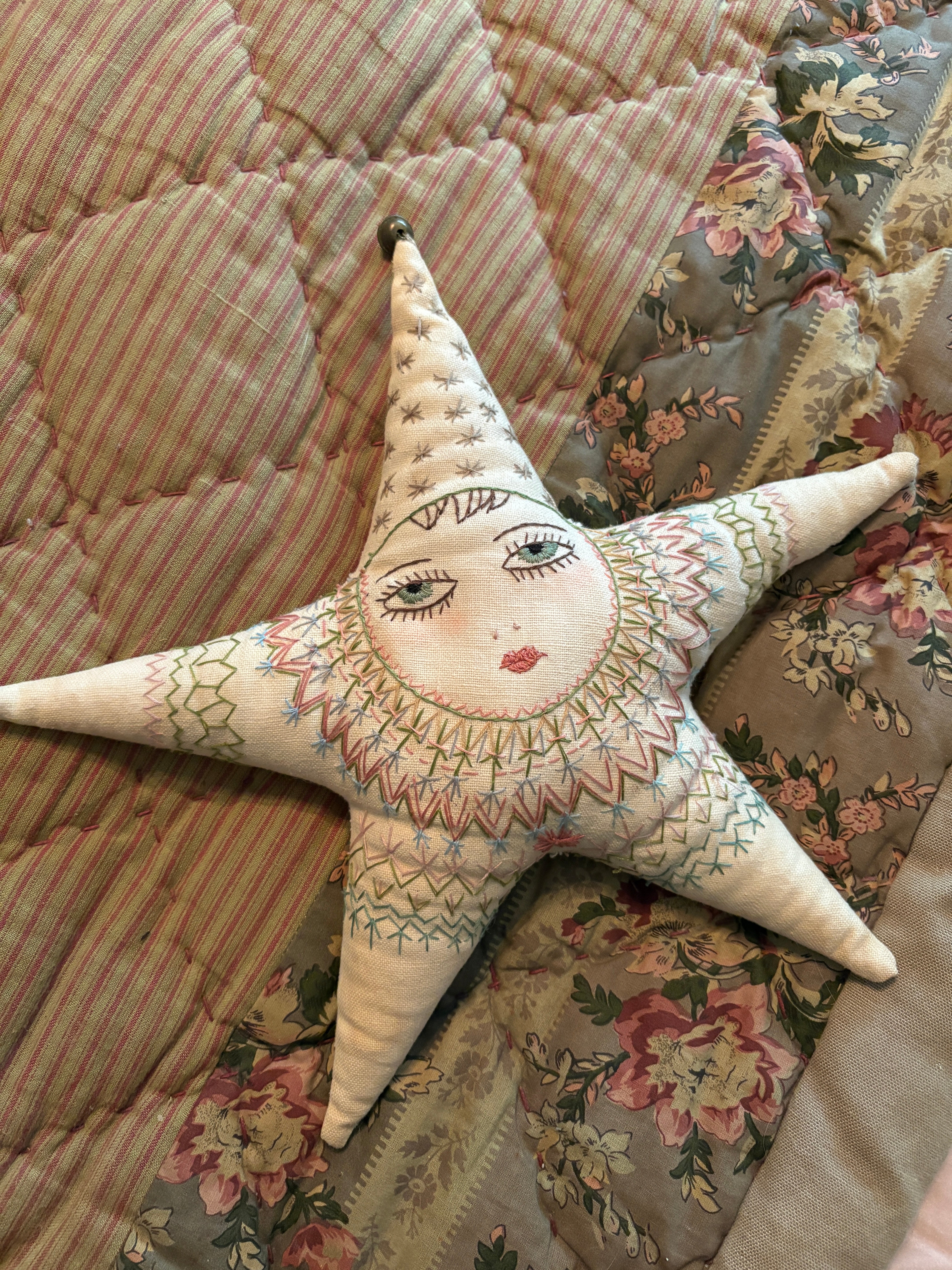 This odd little fellow hails from a nostalgic brooch during the war era when spirits were lifted by whimsy. Stars were the theme of many decoratives including bean bag pillows with embroidered faces (I cherish mine…shown here as a teaser. Maybe we will bring it back…)