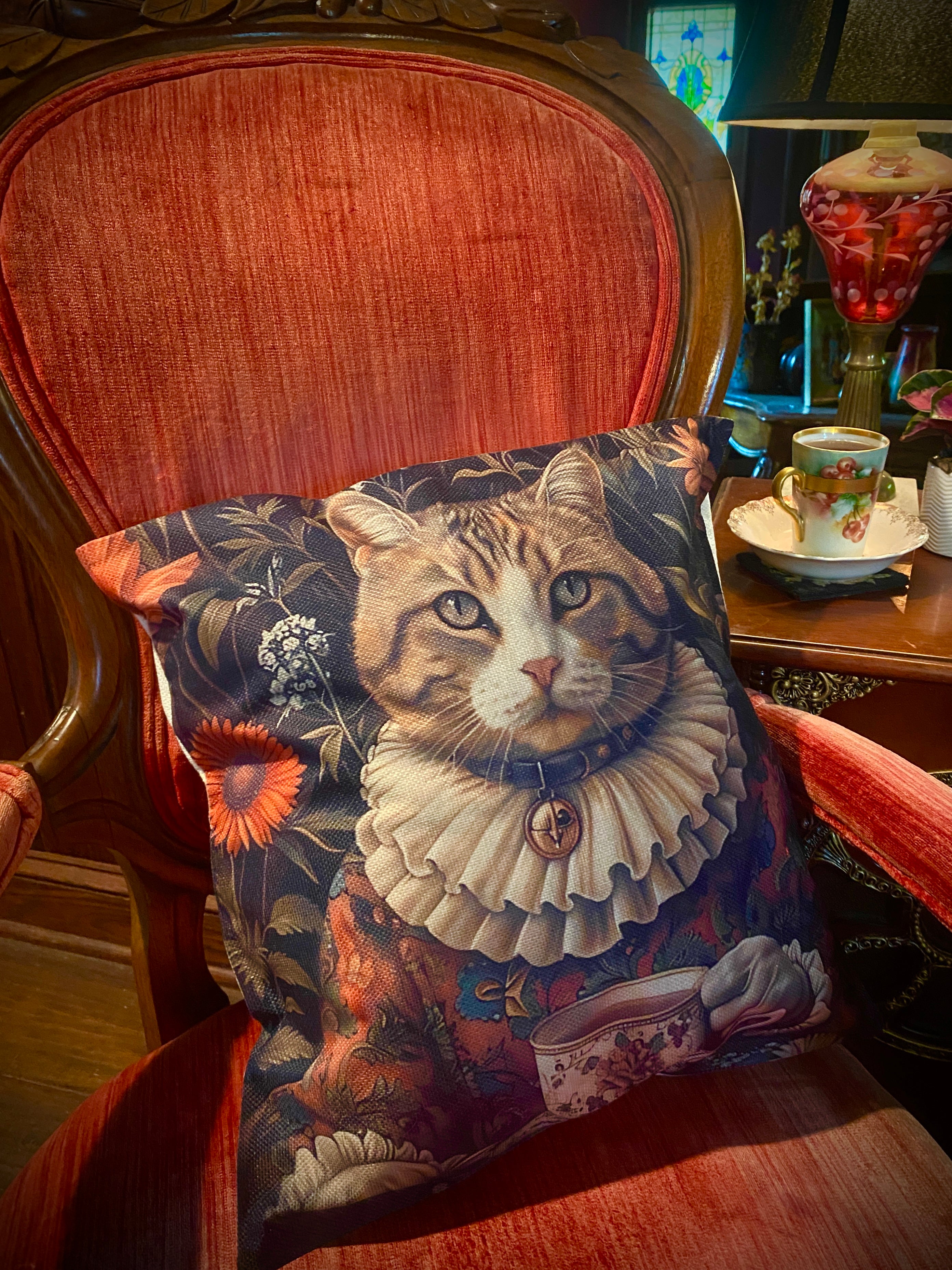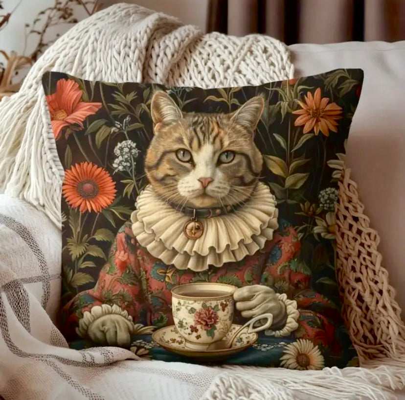 A prim and proper puss extracted from a children’s book inspired this amusing sofa pillow. Rendered in an autumn palette of teal, scarlet and ochre, this divan decor summons a smile at first glance. Rendered to a vegan velvet ultra-suede. Printed on both sides. Discreet zipper at base. 18” square. Available with or without pillow filler.