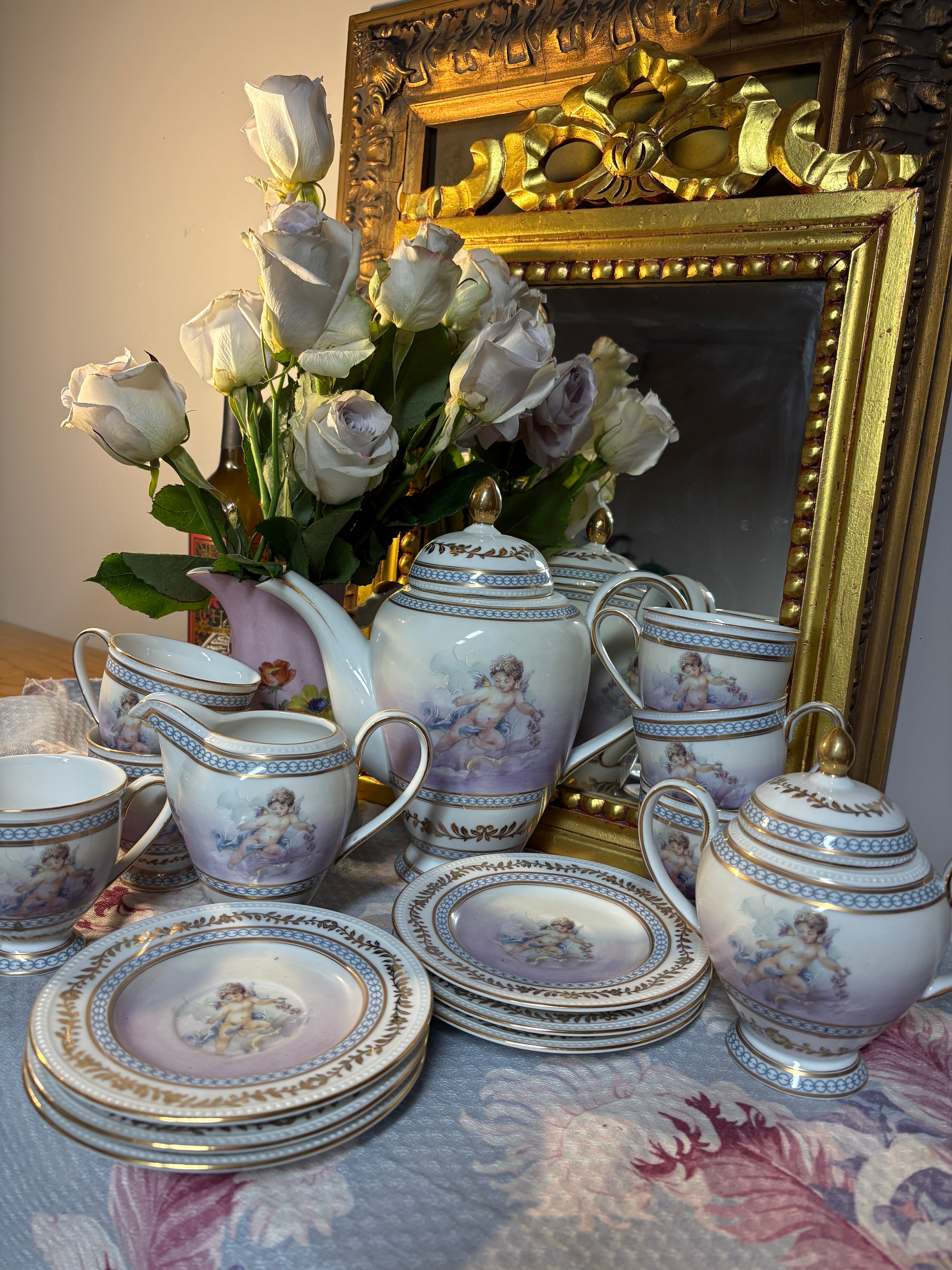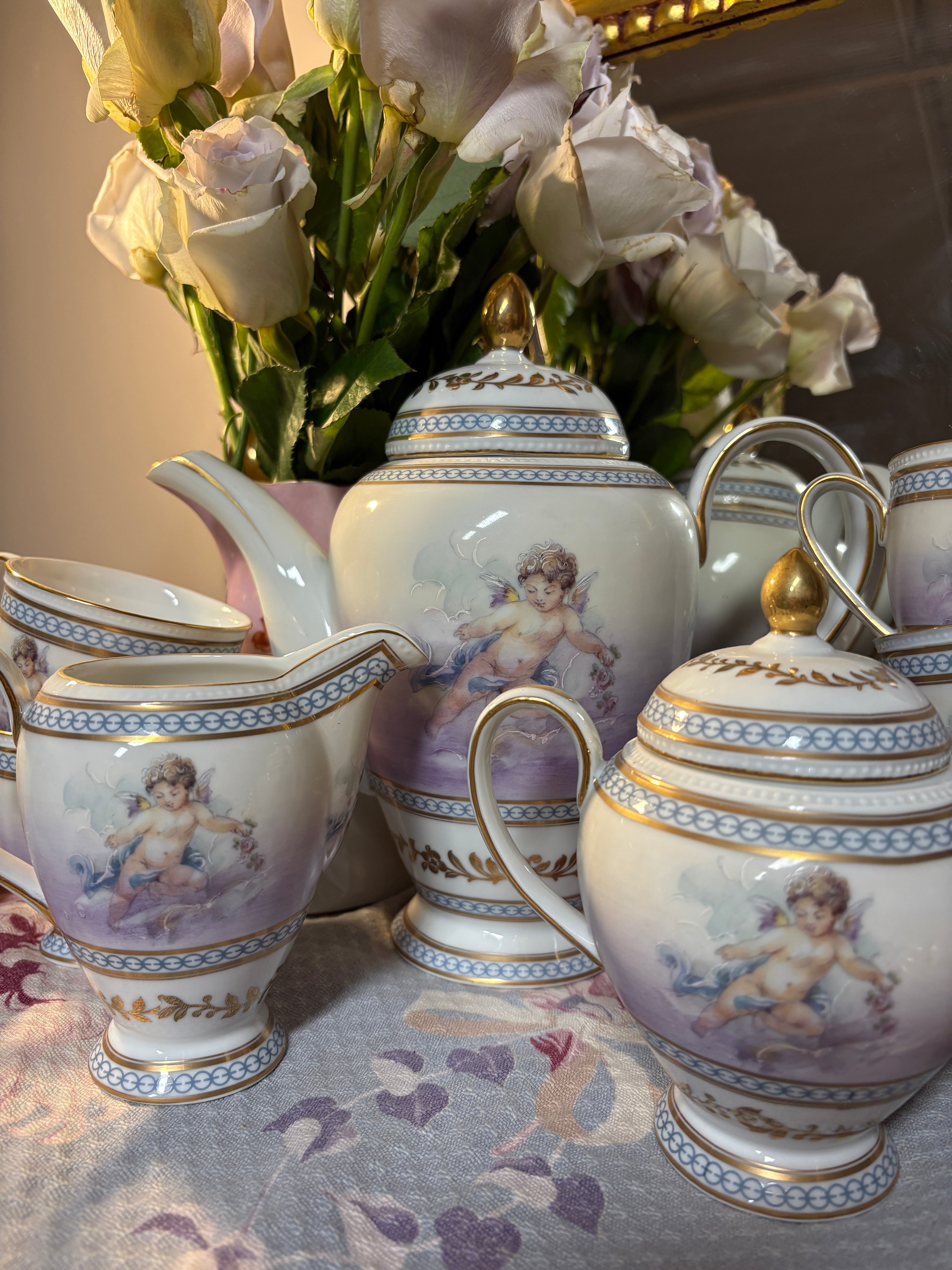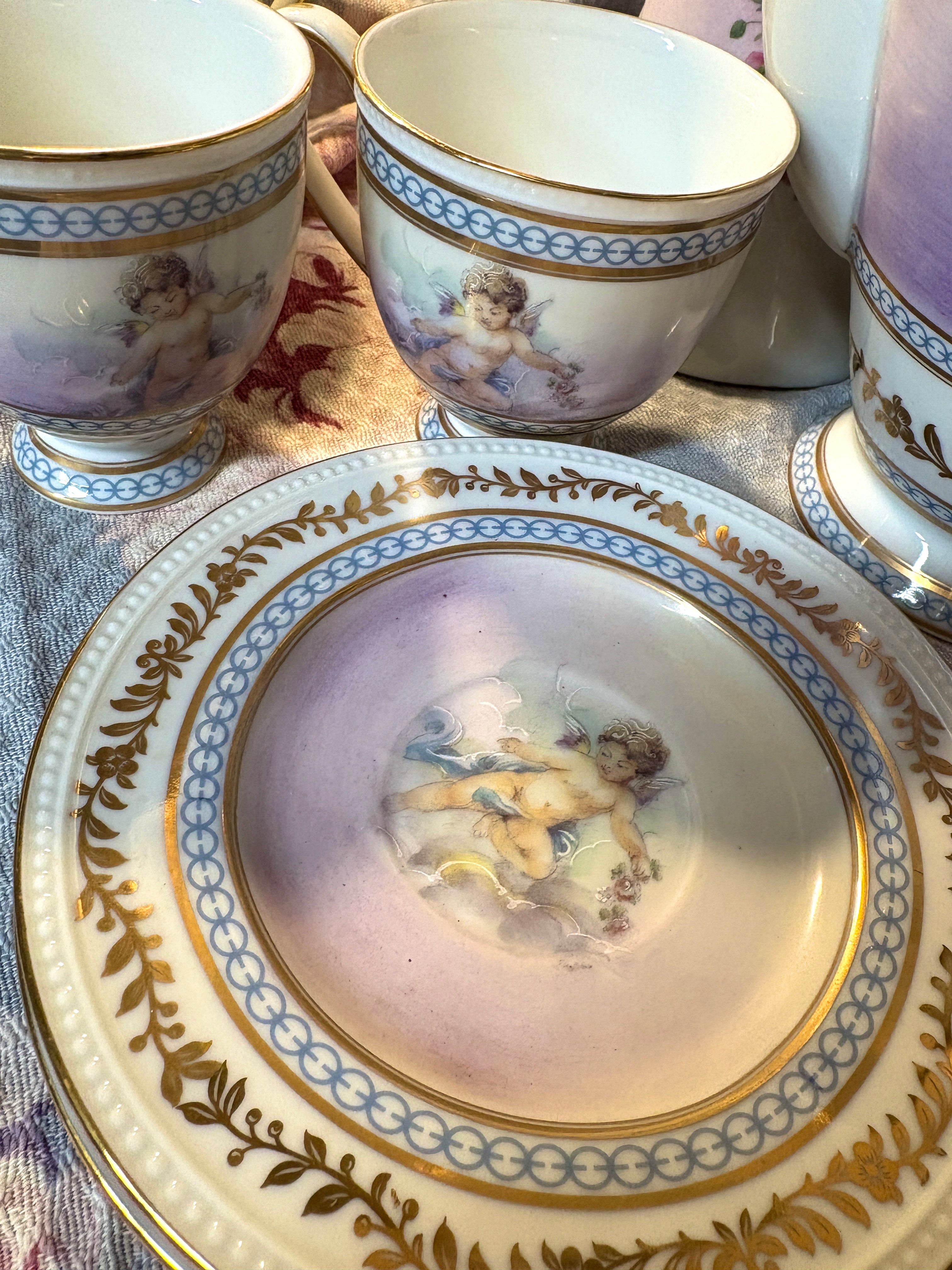 Worthy of royalty, a complete 15 piece tea set has been faithfully reproduced from a coveted estate collection that endured years of secrets and sugar cubes. Delicate pastel cherubims adorn fine porcelain with gold leaf flourish. 15 pieces. Only a few sets remain. 10x11x6