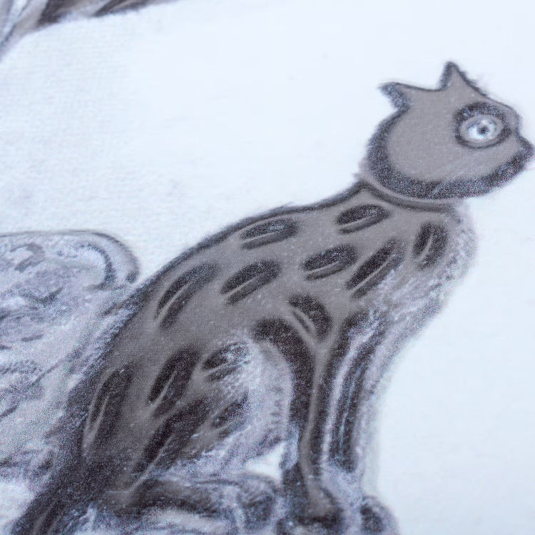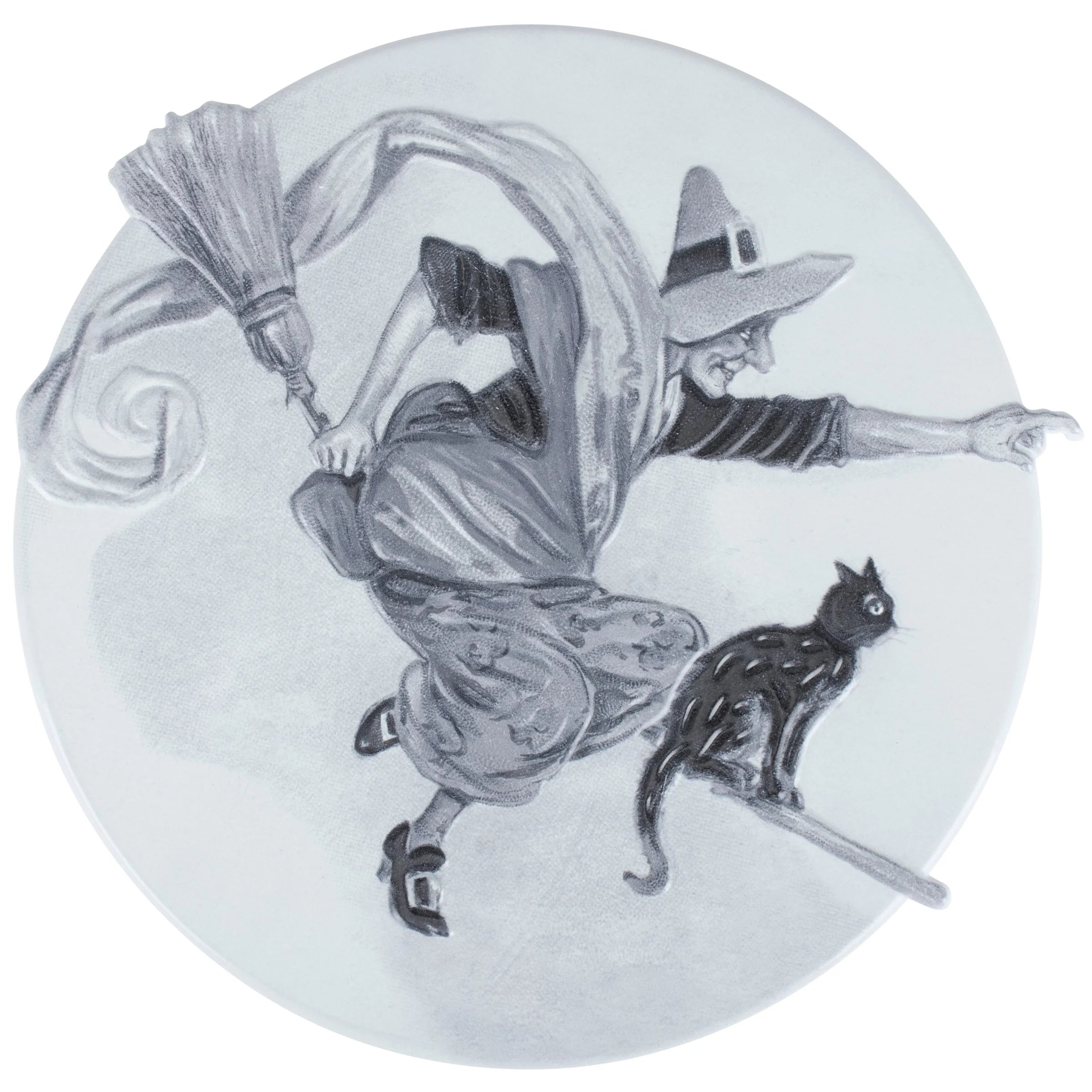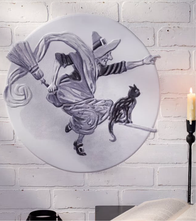 A darling duo takes to the midnight sky on their enchanted broomstick. Sure to bewitch the hearts of all who encounter her charms, Martha and her black cat Morton, will be a favorite for years to come. Metal monochrome hand illustrated style. features embossed details for added dimension. Easy to hang for display via the attached sawtooth hanger. Dimensions: 18" Diameter Limited Quantities