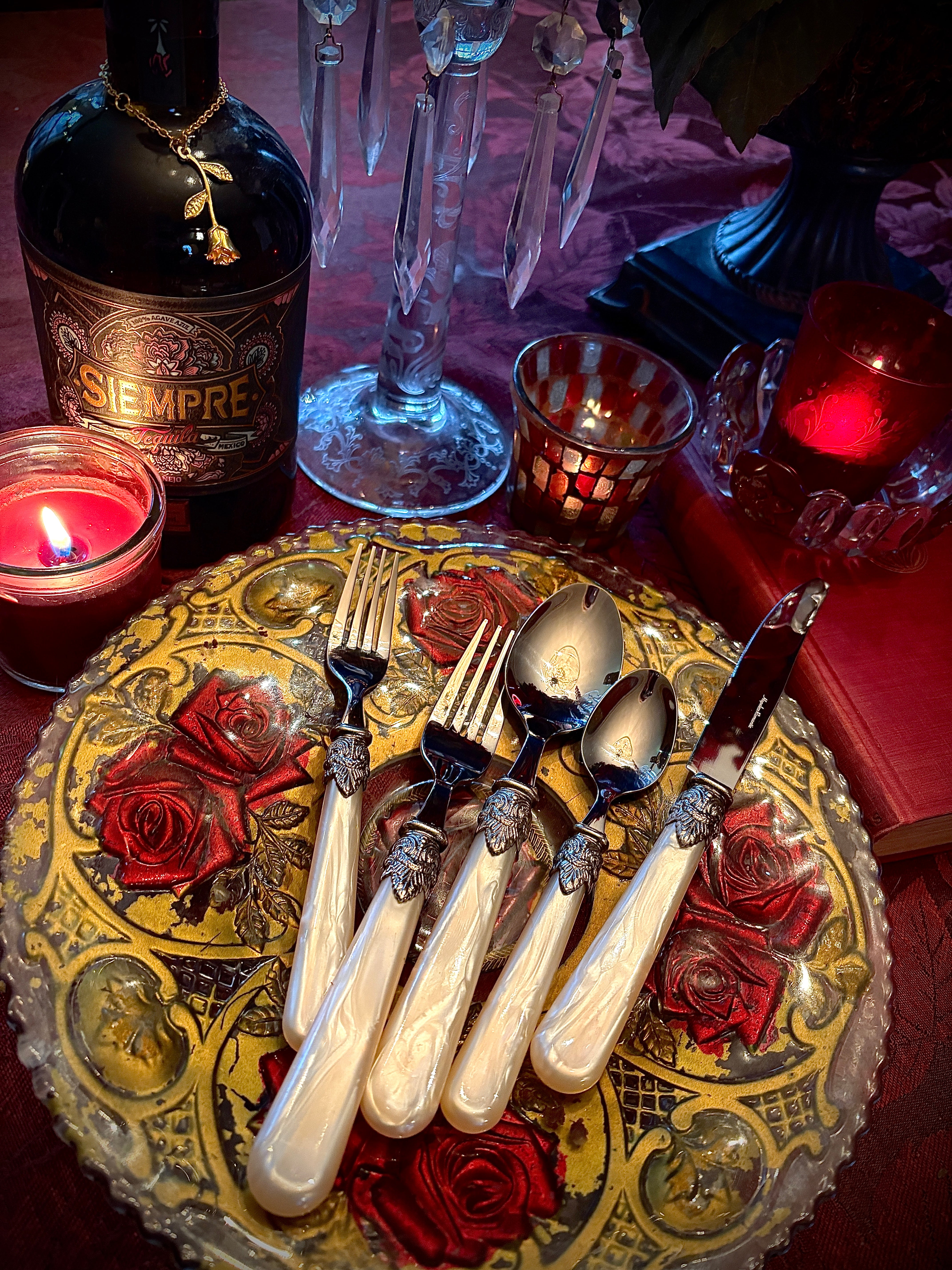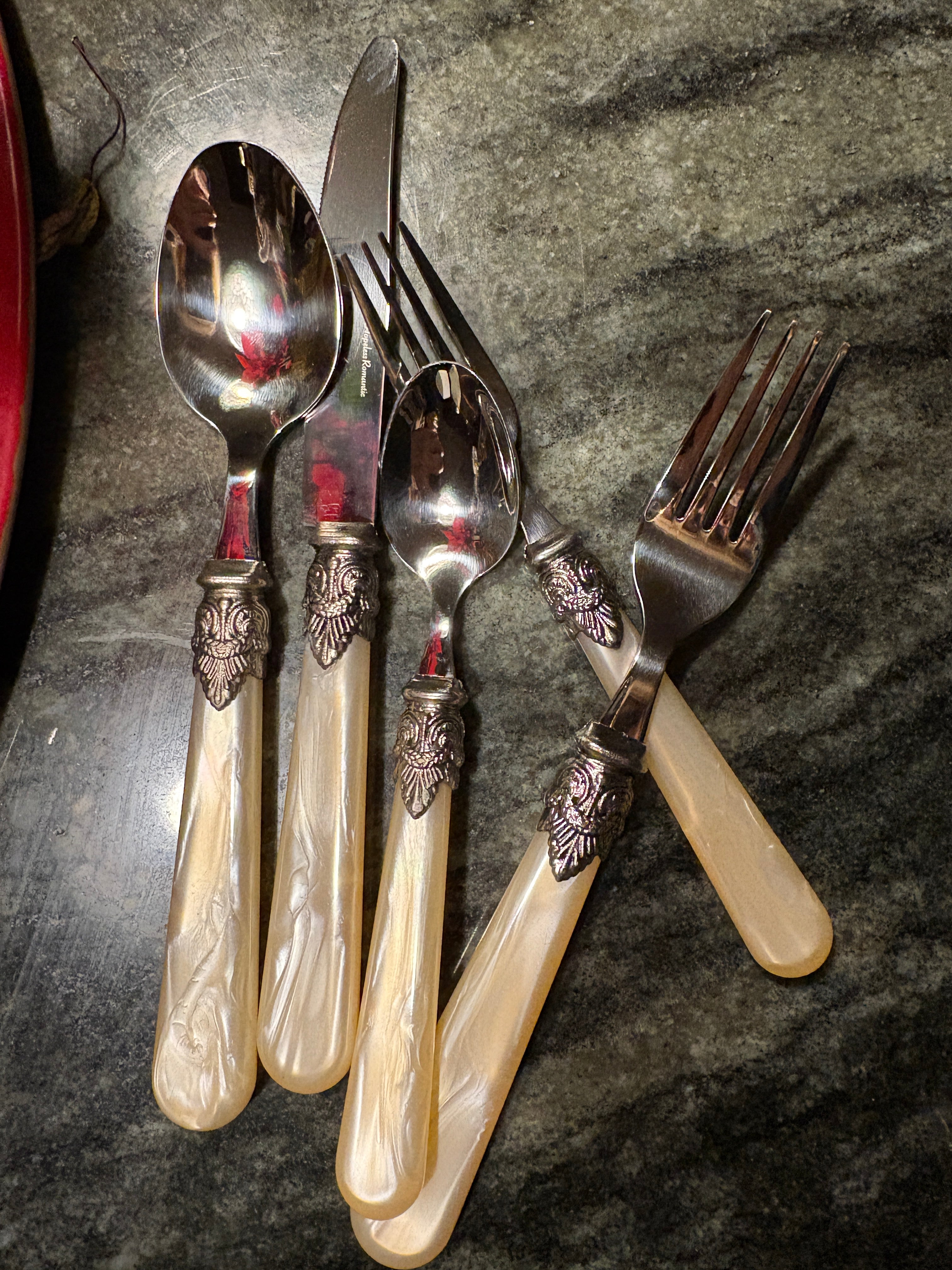 Opulence at hand inspired by hand-carved Mother-of-Pearl cutlery circa 1840. Swirls of opalescent cream with subtle caramel-veined handles summon a divine confection that complements the champagne while flirting with the candlelight and chandelier. A Baroque band marries the eating utensil to the smooth handle. These will blend beautifully with bone china, crystal and white linen cloths. Set of five utensils includes salad and dinner fork, tea spoon, dinner spoon and knife and arrives in a velvet drawstring bag. Faux Mother-of-Pearl composite and Stainless Steel. From Hopeless Romantic.