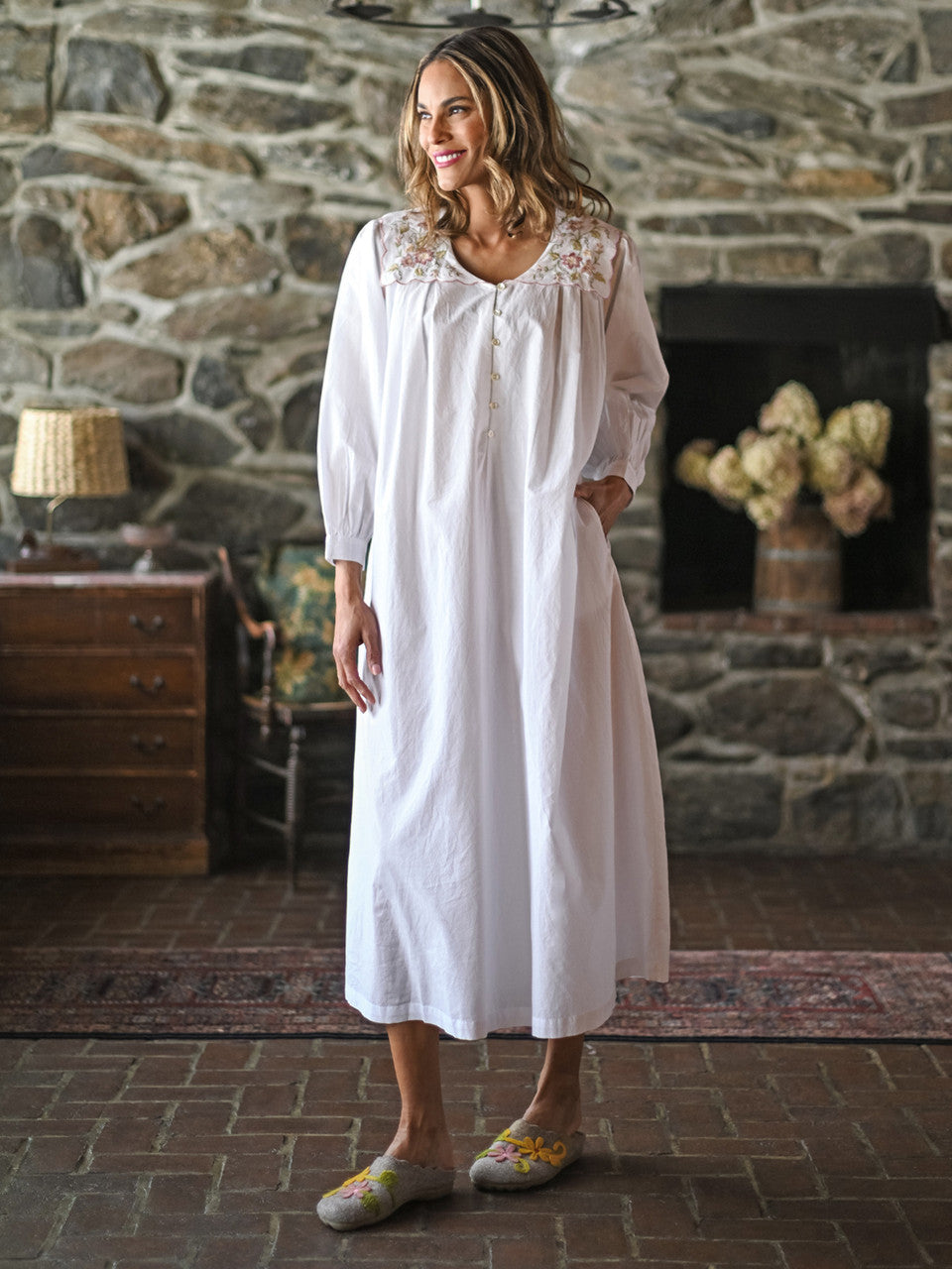 A poetic dream in cotton featuring hand-guided floral embroidery with a scalloped edge, delicate pleats, mother of pearl buttons and pockets for your paper and pen.