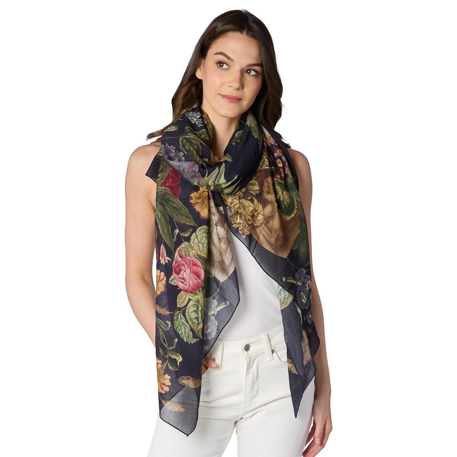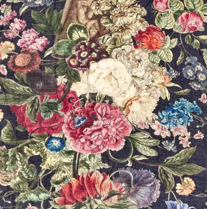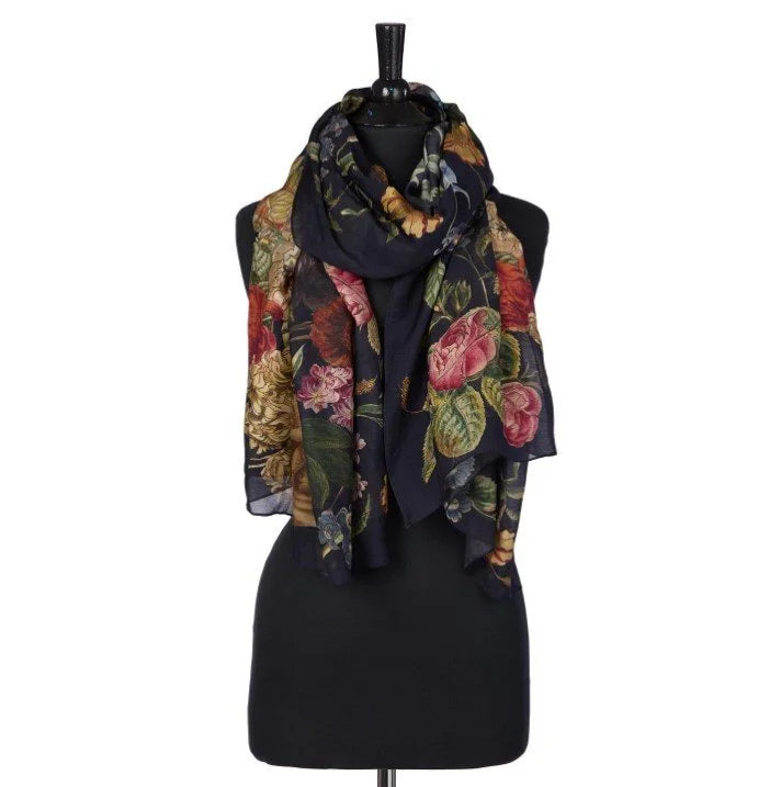 Designed by two lovely ladies of Sheffield, England, the pattern on this luxurious scarf are steeped in romance. Patterned after blooms from the art of the Dutch Masters, this exquisite piece drapes elegantly and surrounds you with sheer luxury. A blooming bouquet of primroses, auriculas, and polyanthus flowers in a stunning range of bold colours. The detail in this print is spectacular! Make haste! Only 2 left