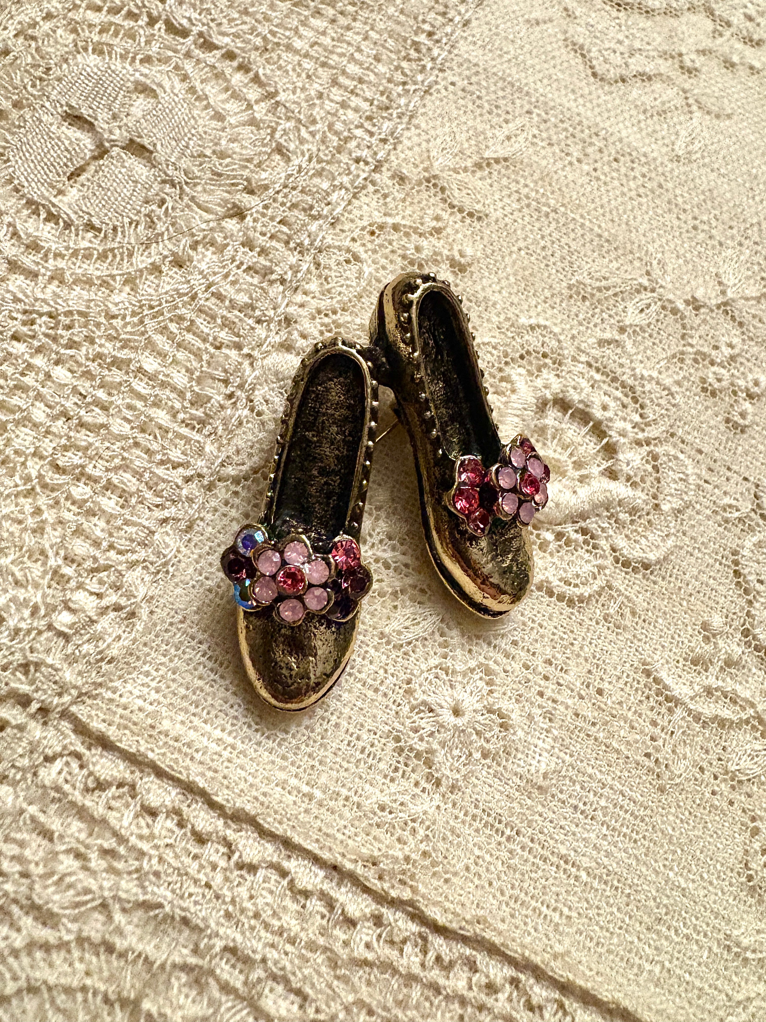 A petite pair of prim slippers are beyond precious upon a lace bodice or lapel. A gold-toned plating upon copper is cast from tiny doll shoes. Opalescent crystals encompass pink petals with a rose-stoned center. 1 3/8”