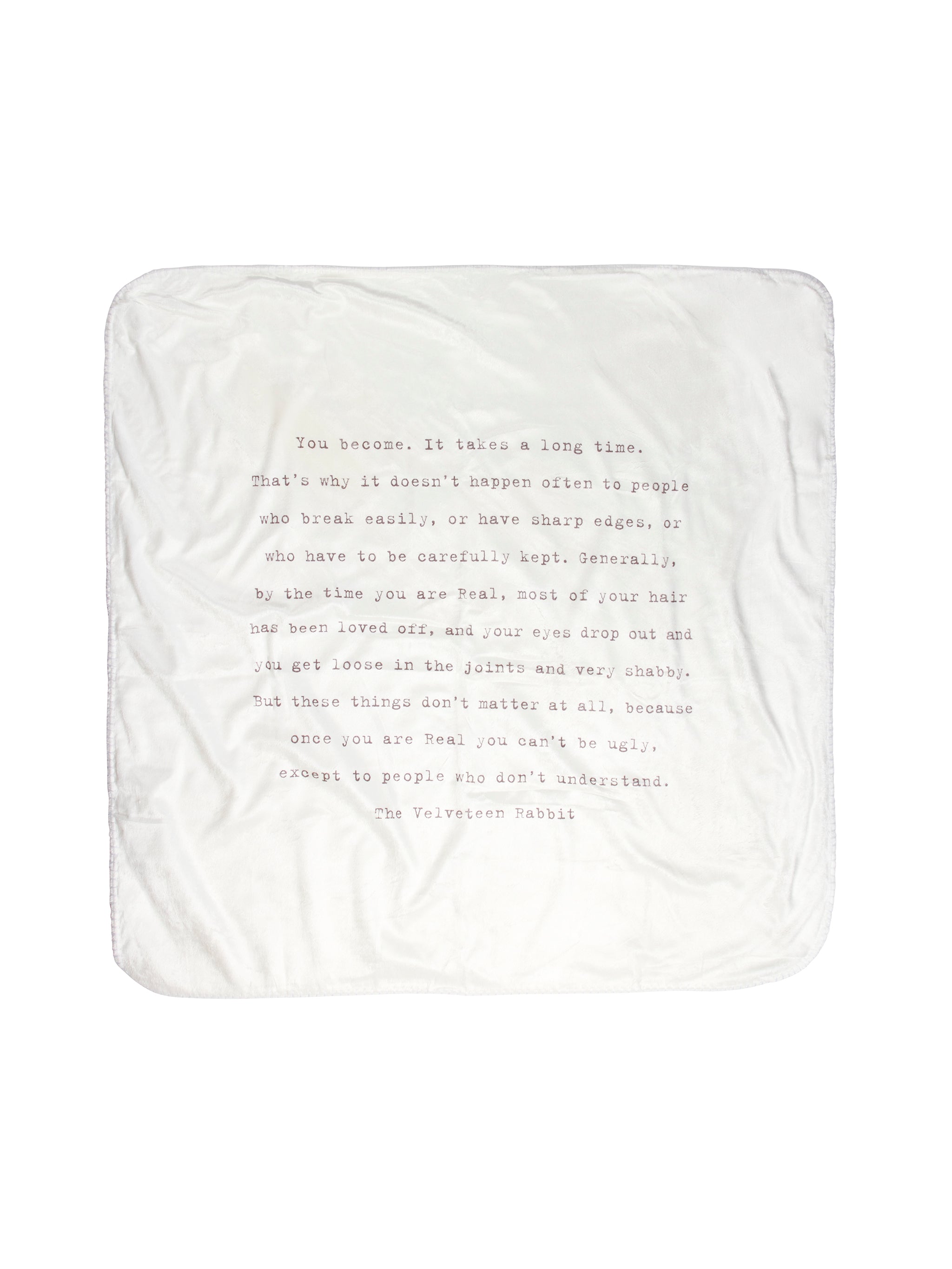 Ideal gift for meaningful birthdays, new babies or for any one you hold dear in your life. Guaranteed to bring tears to your eyes, a best-loved excerpt from The Velveteen Rabbit is printed on a buttery soft blanket to remind us all that it doesn’t matter what people think, you are perfect the way you are.