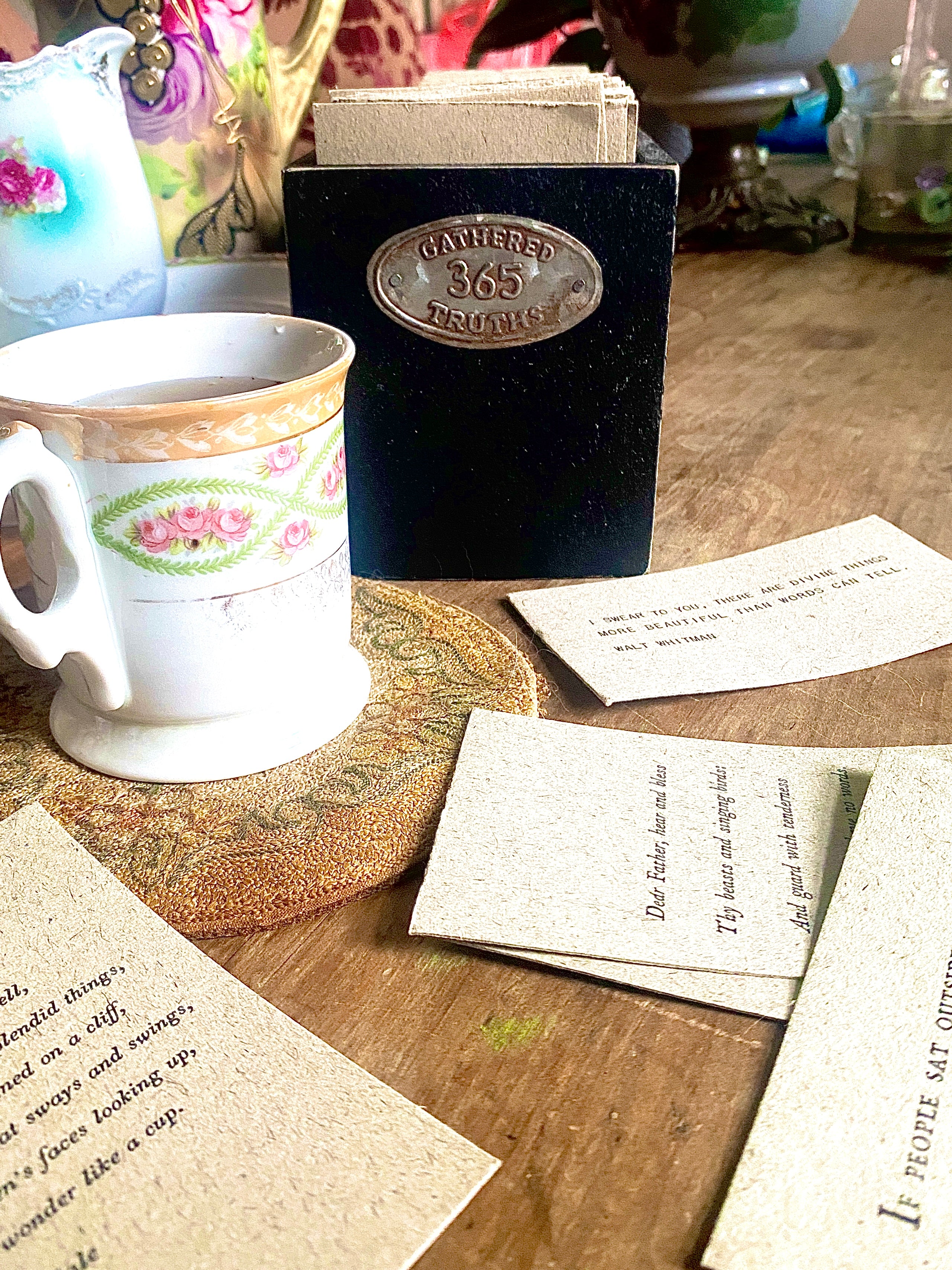 This treasured box of wisdom is a beloved Capen family favorite . Each morning, our dear father, 100 years of age, faithfully pulls a card from our box and reads it, taking time to discuss and ponder its significance. Handcrafted paper filled with 365 thoughtfully chosen quotes for each day of the year. A plethora of knowledge and pensive soul searching awaits! Free Shipping!