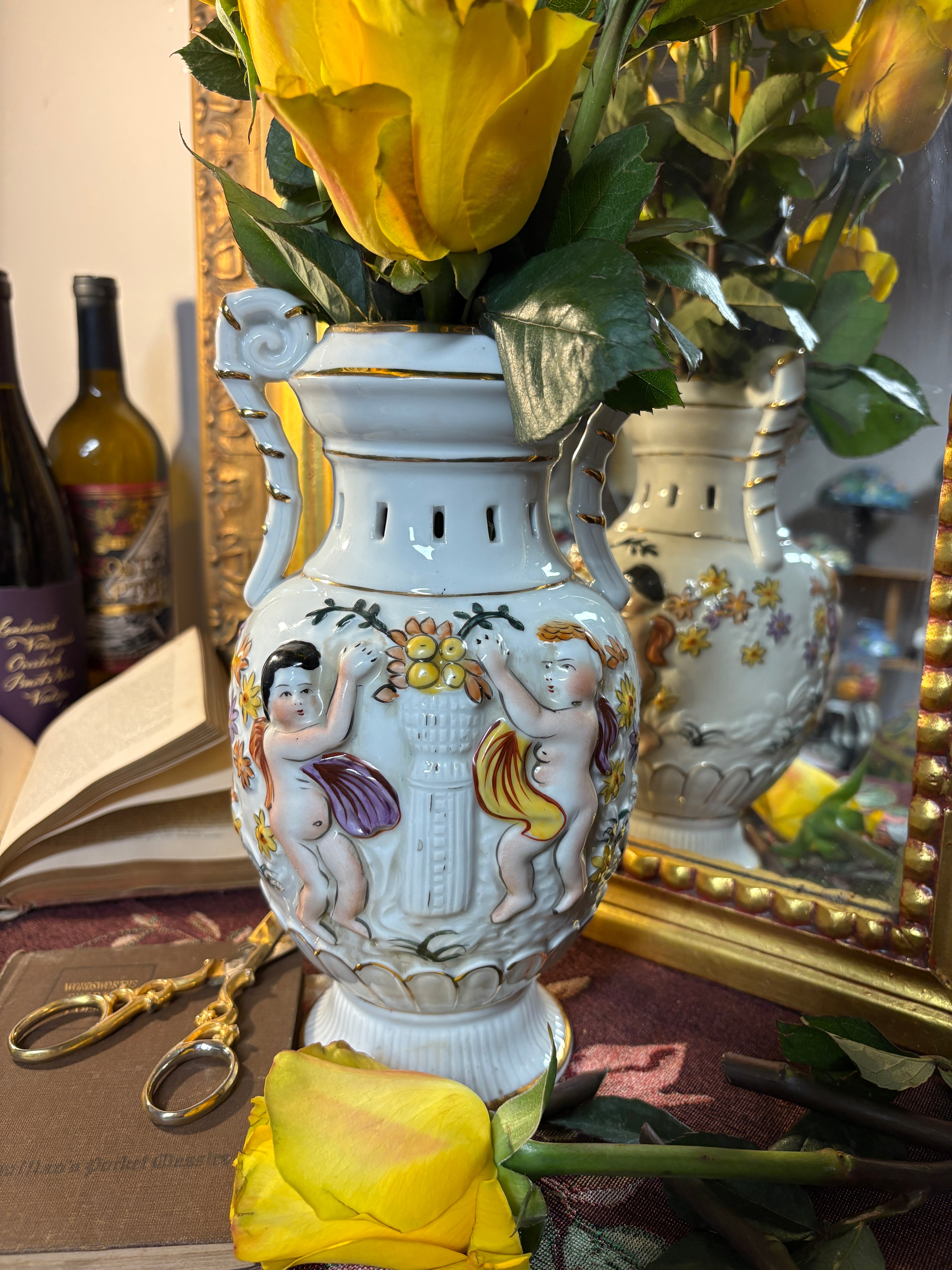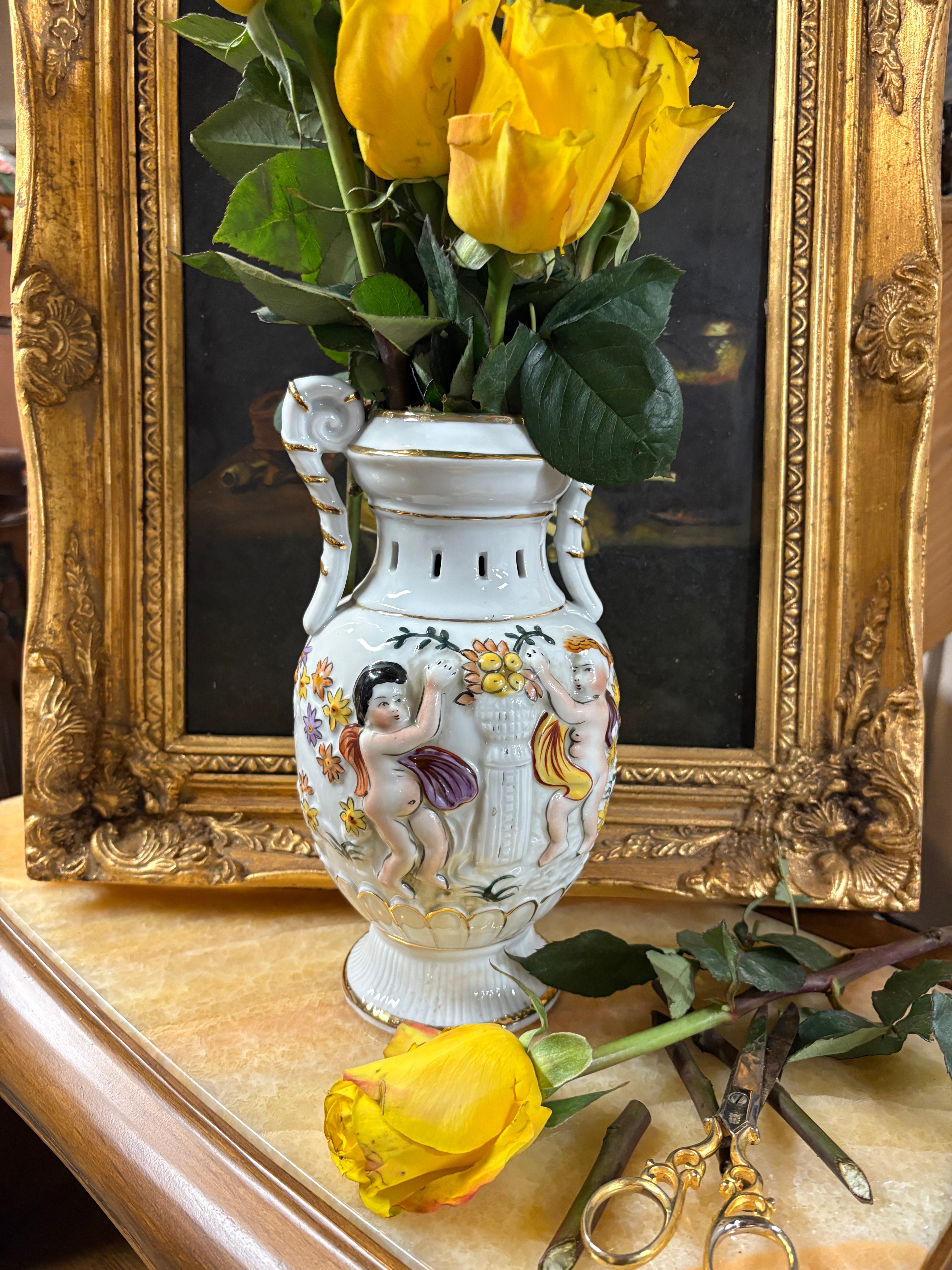This one awaits your roses. Capodimonte porcelain is a renowned style of Italian artistic ceramics with origins in Naples mid-18th century. The porcelain is fired from a soft-paste, known for its creamy tone and fine grain, which allows for the creation of highly detailed pieces. Though this is a vintage replica from several decades ago and cast from a coveted antique, the detail is intricate and indiscernible from the antique original. Hand-painted.