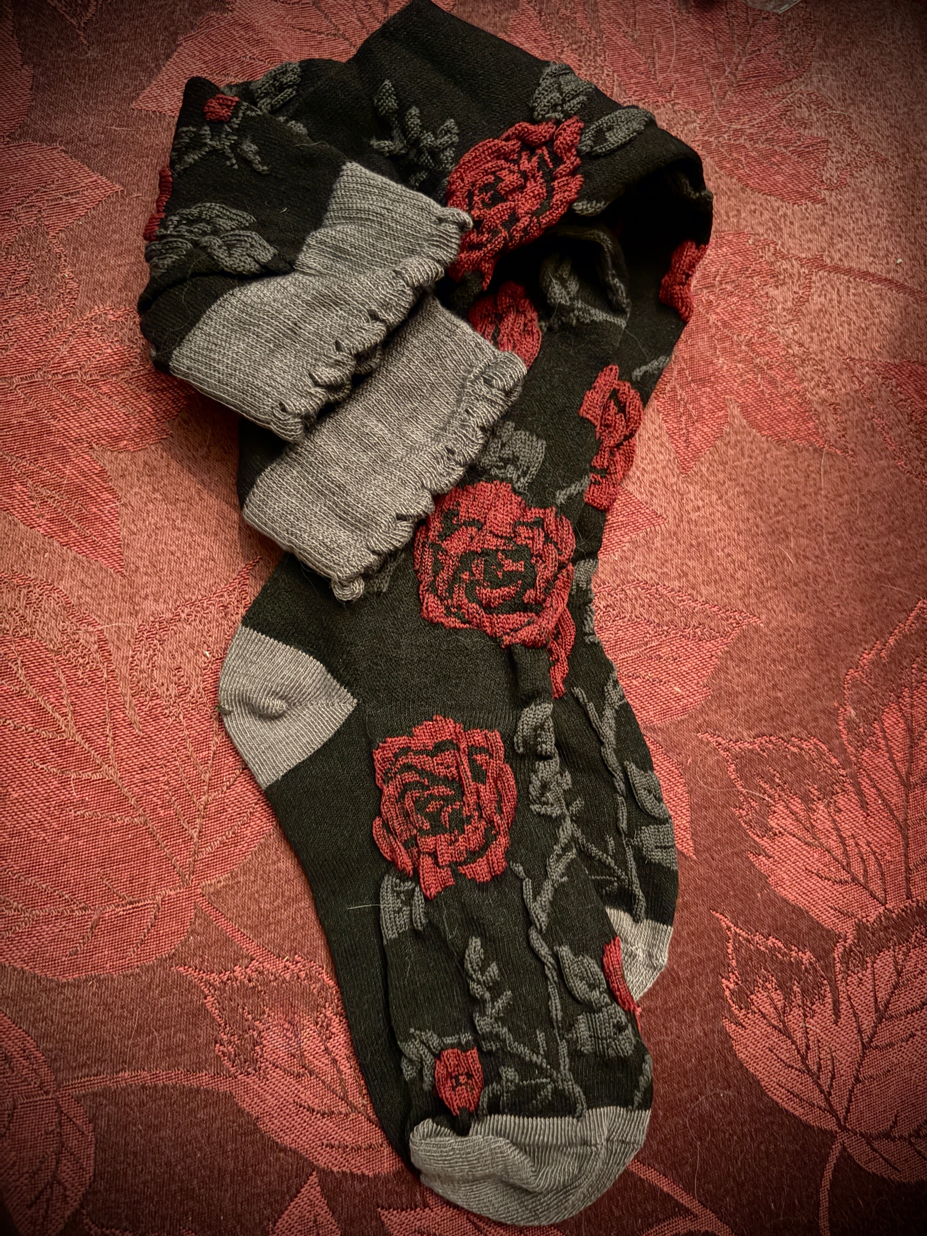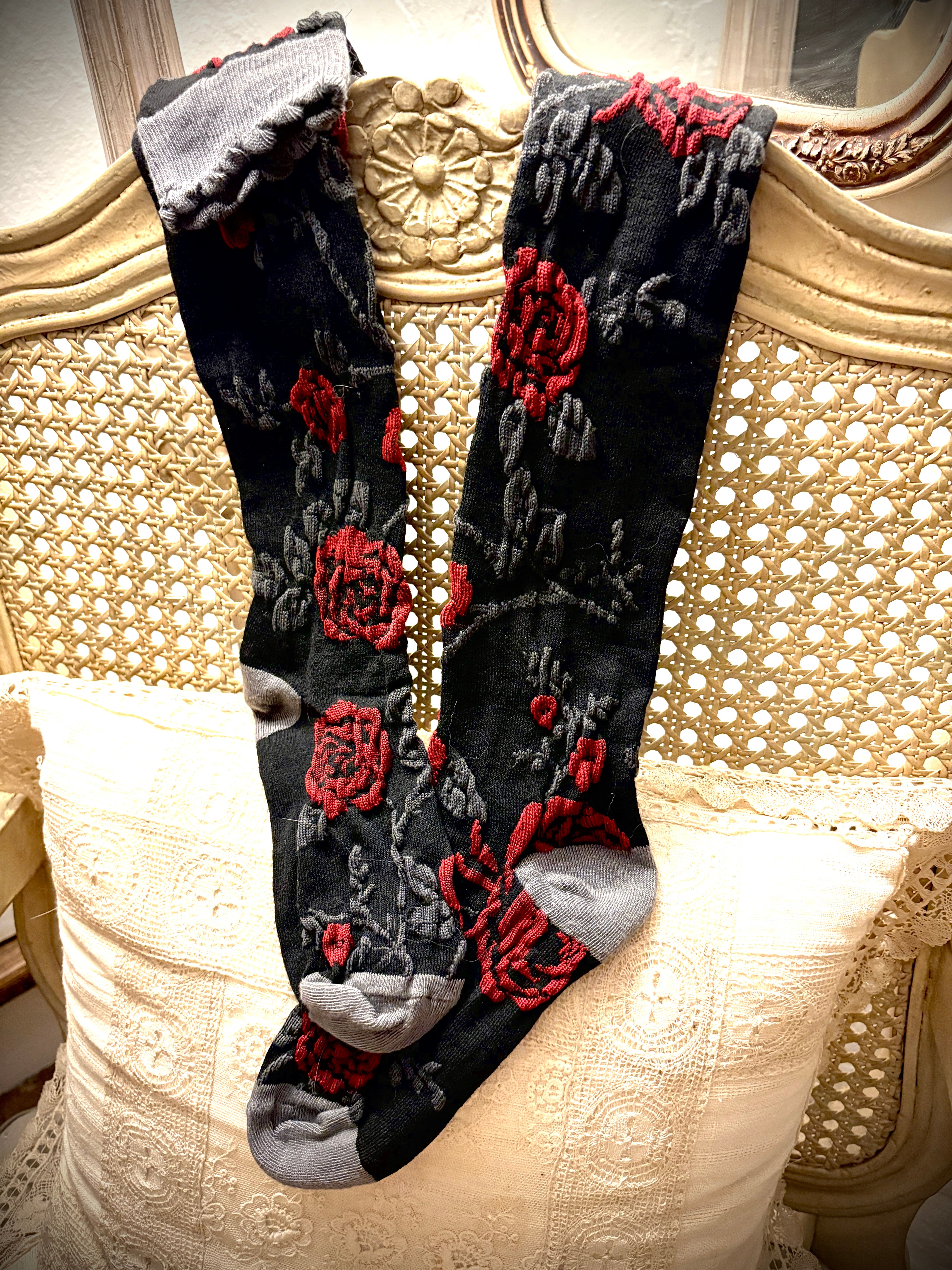 The thorned bloom is woven within soft, sustainable fibers that hug the legs with comforting compression all the way to the knees. Just knowing you have something pretty under skirts and pants is sweet. I love to wear day dresses and refuse to tug at tights. I can easily pull these above my knees…just as the French schoolgirls do.