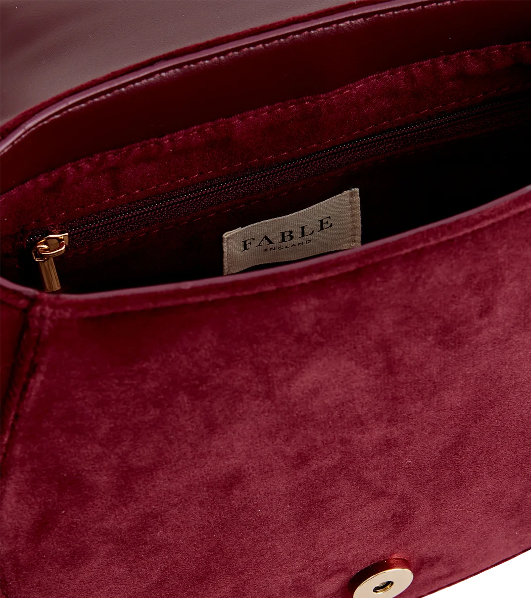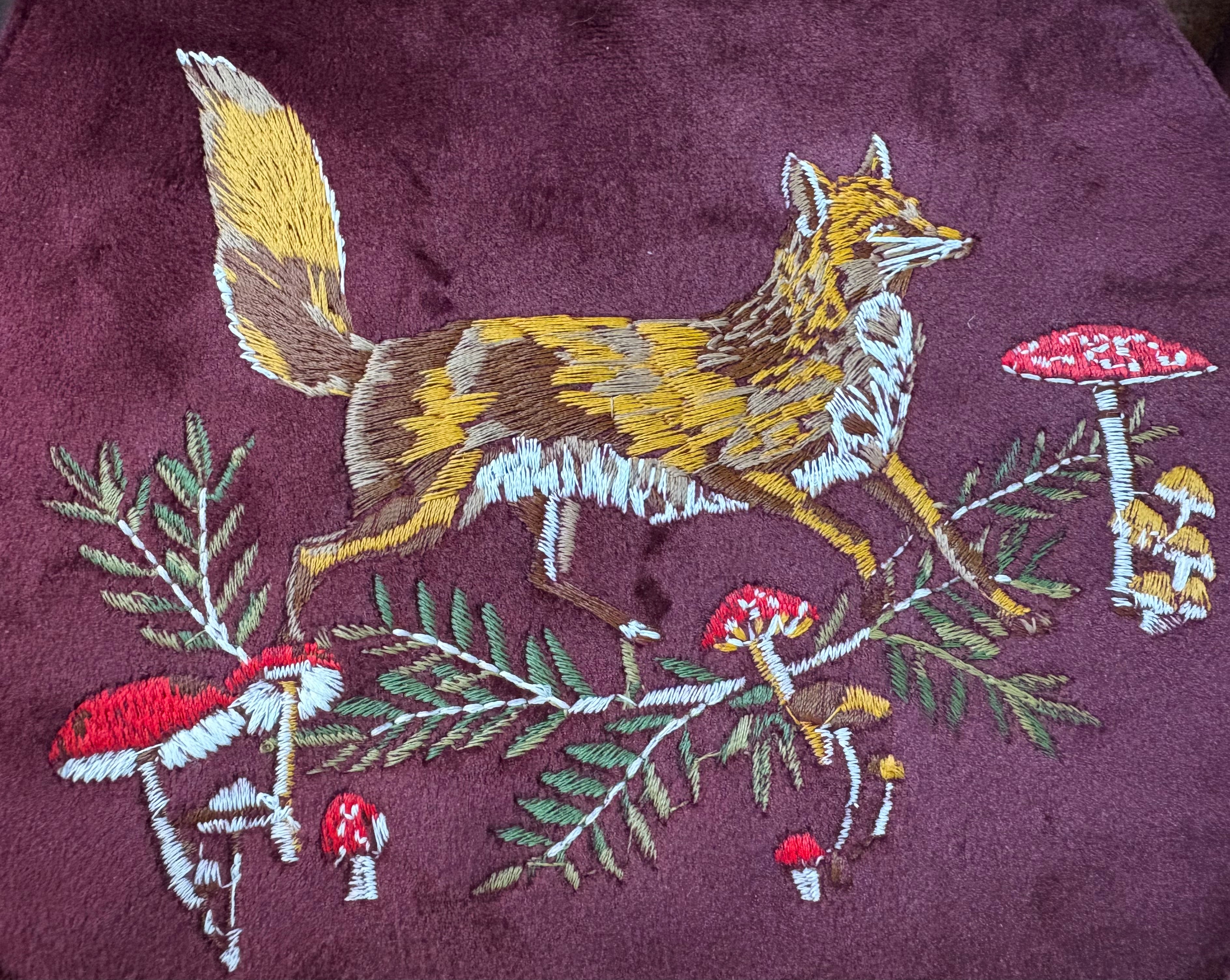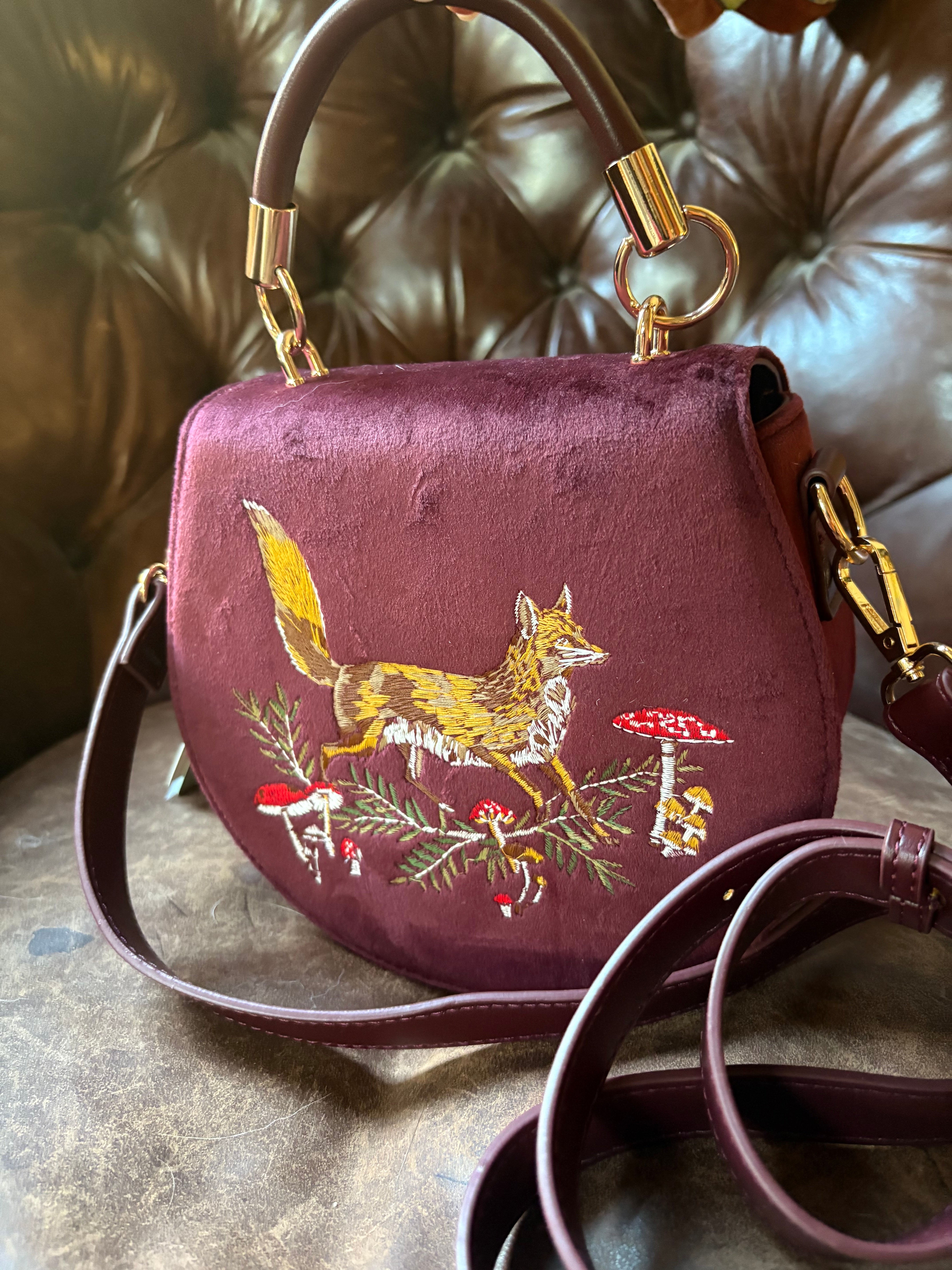 A clever little fellow takes a romp through an enchanted forest. Crafted from sumptuous Red Currant velvet, this storybook purse features a rounded, saddle-shaped silhouette adorned with intricate embroidery depicting a fox amongst toadstools capturing the delicate equilibrium between cunning intelligence and the enigmatic wonders of the natural world. Designed for both beauty and functionality, the bag comes complete with a top-handle for easy carrying and an adjustable cross-body strap for hands-free convenience.