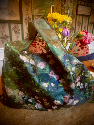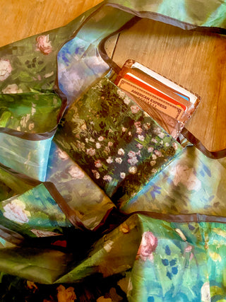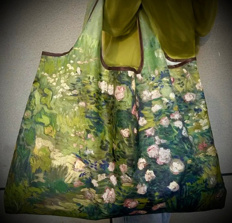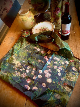 Verdant French impressionism takes to a strong, roomy tote that cleverly folds itself neatly into a teensy inner coin pouch square. 22x26” capacity. Washable, lightweight, water repellant nylon.