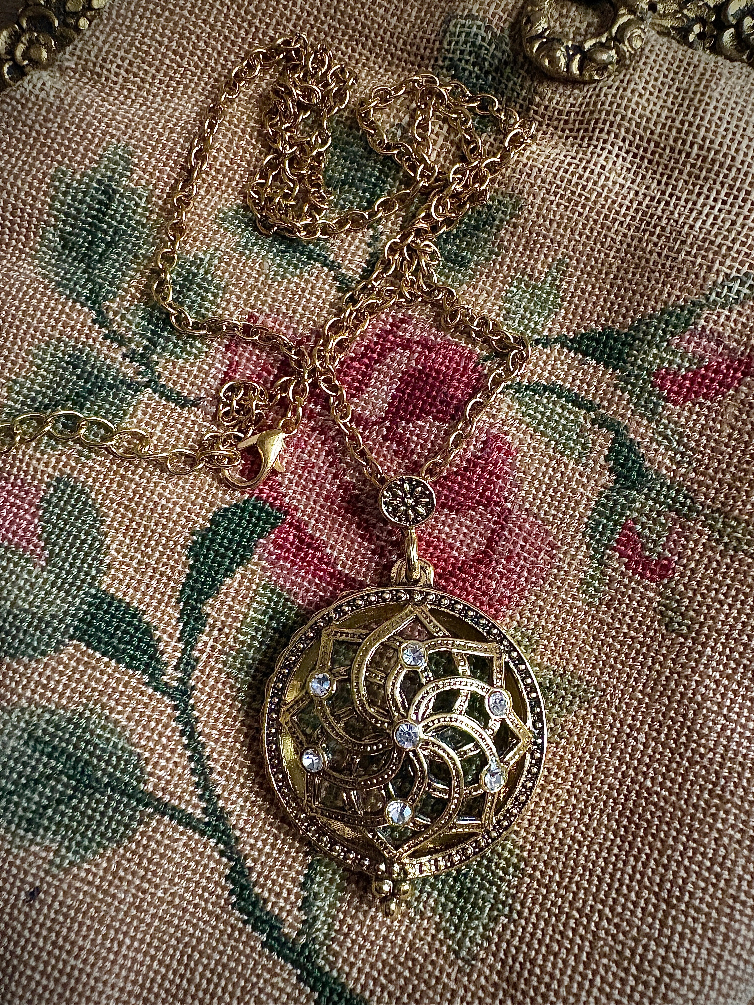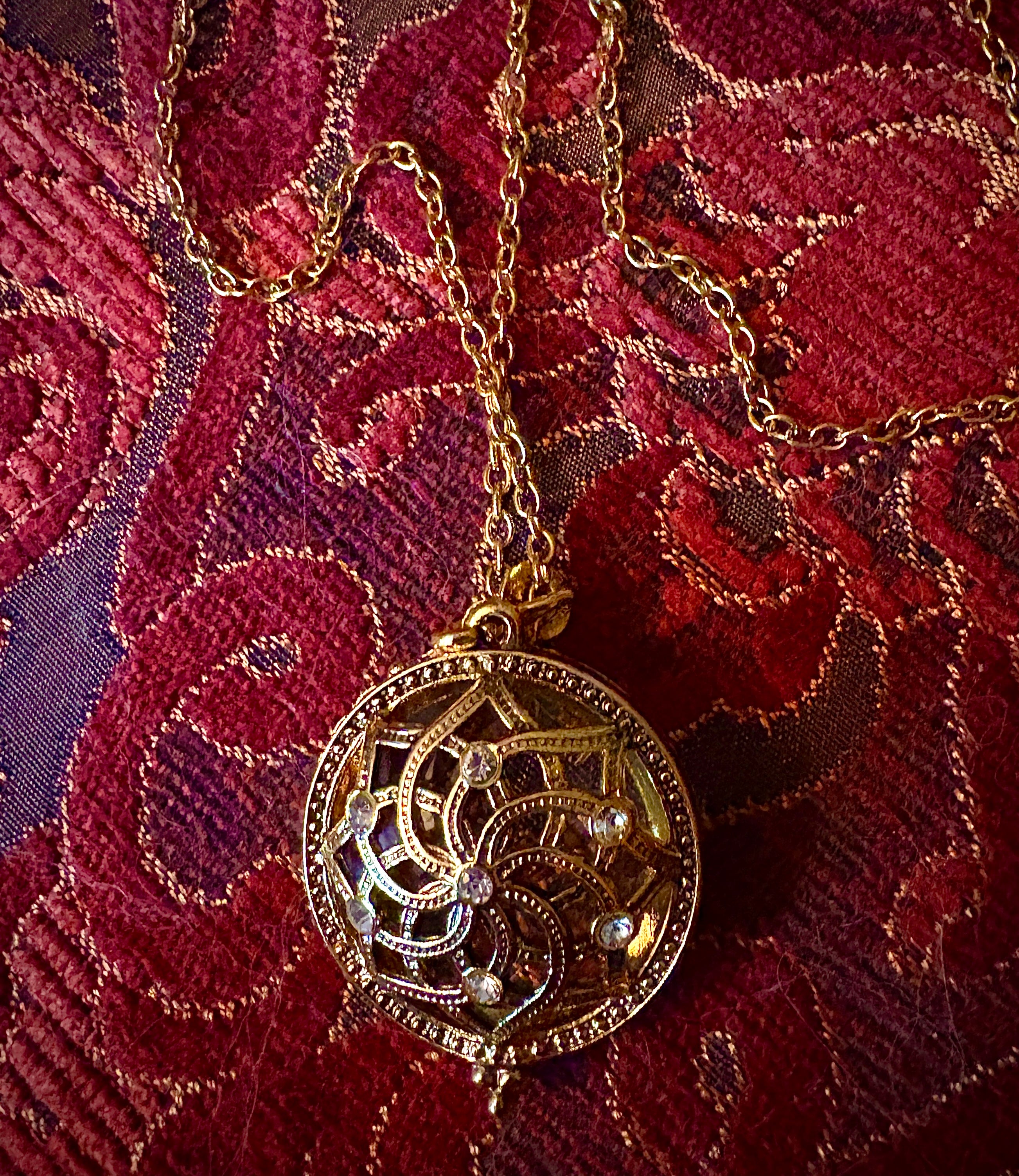 We only have a few…seven glistening crystals punctuate a cast brass vinaigrette casing that swivels open to a mighty lens that reads menus and price tags for you, and then discreetly hides with a magnetic closure.
