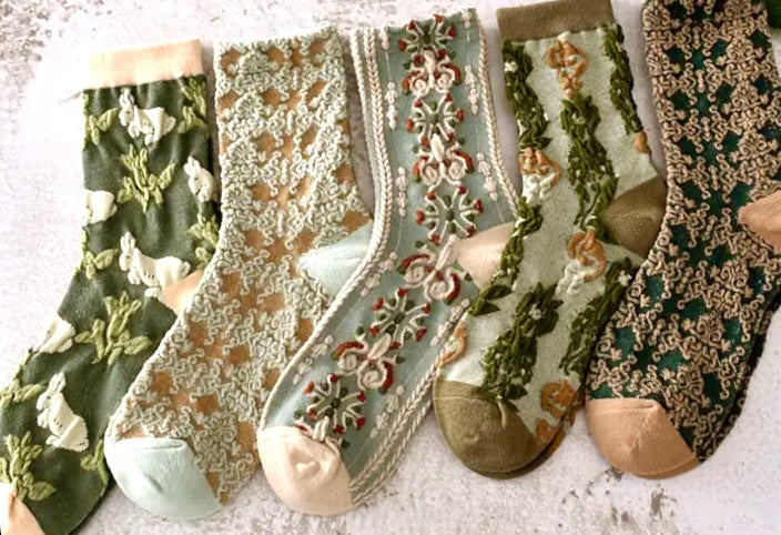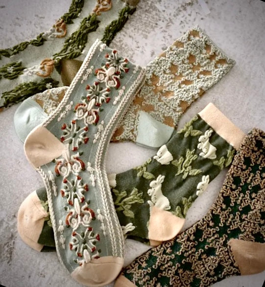 Just look at the bunny pair! Heart be still. Spongey, cushy, soft and sweet…these stretchy socks are inspired by Nordic stockings and are spun in woven yarns of moss, seafoam and cream. Pad around your cozy home in these or allow them to peek out from long dresses, birk sandals and sneakers. Assorted set of 5.